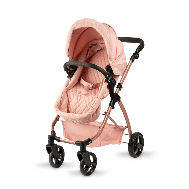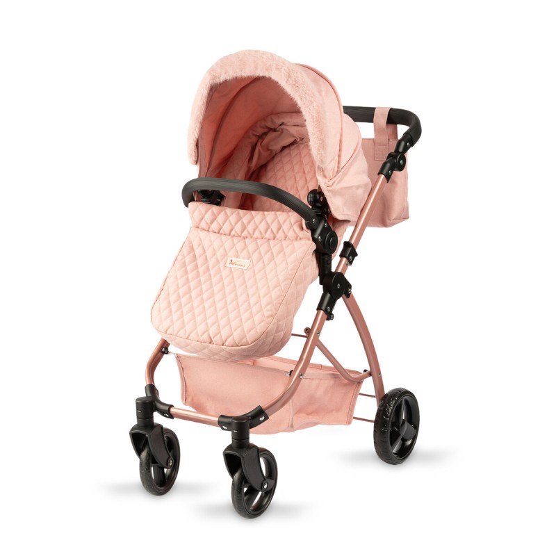 Ekskluzywny wózek Modern Mami w kolorze brzoskwiniowym dla lalek to połączenie funkcjonalności i estetyki. Może posłużyć jako wózek gondola i wózek spacerówka. Gondolę można łatwo przekształcić w wózek spacerówkę.