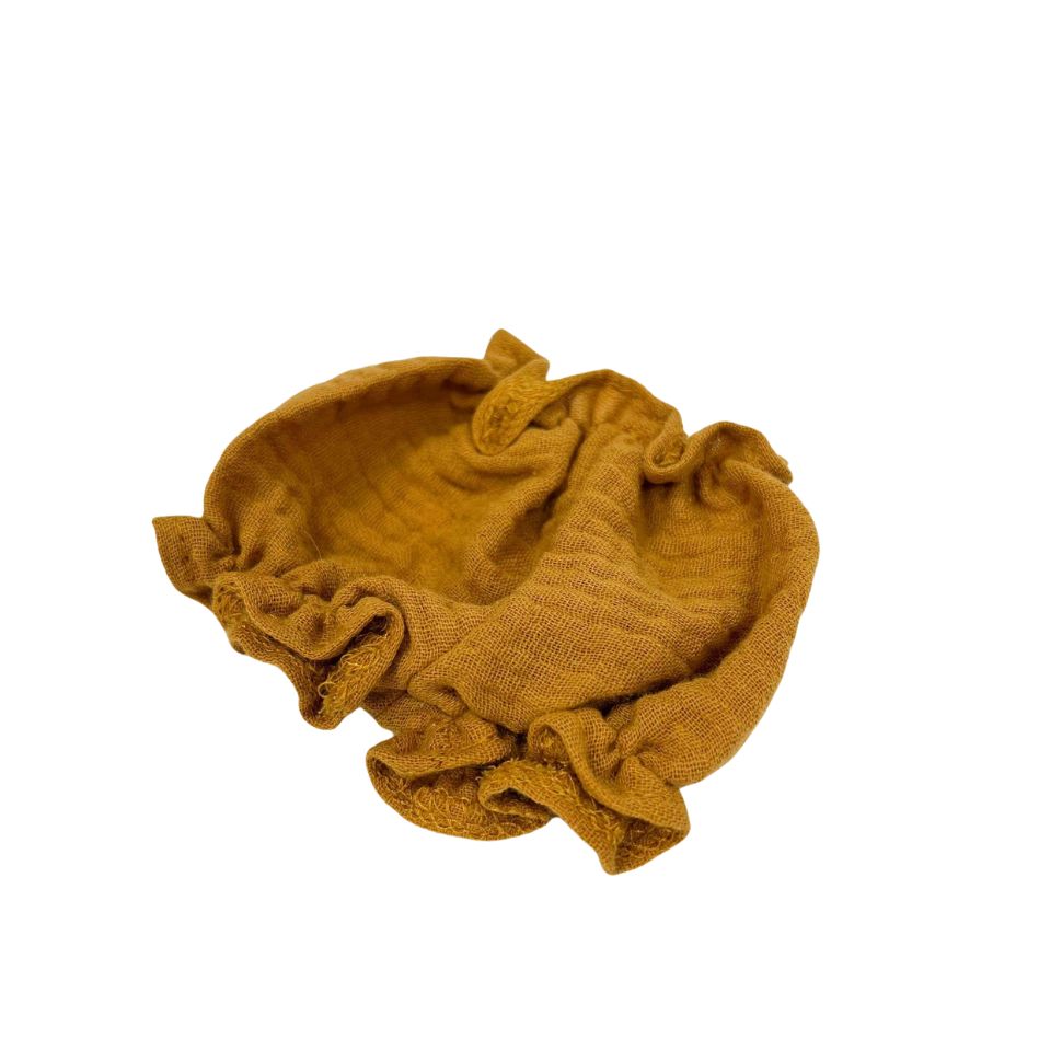 Piękne muślinowe bloomersy w kolorze musztardowym uszyte specjalnie dla hiszpańskich lalek Miniland Baby 21 cm. Pasują również na lalki Paola Reina Peques 21 cm i Paola Reina Amigas 32 cm.