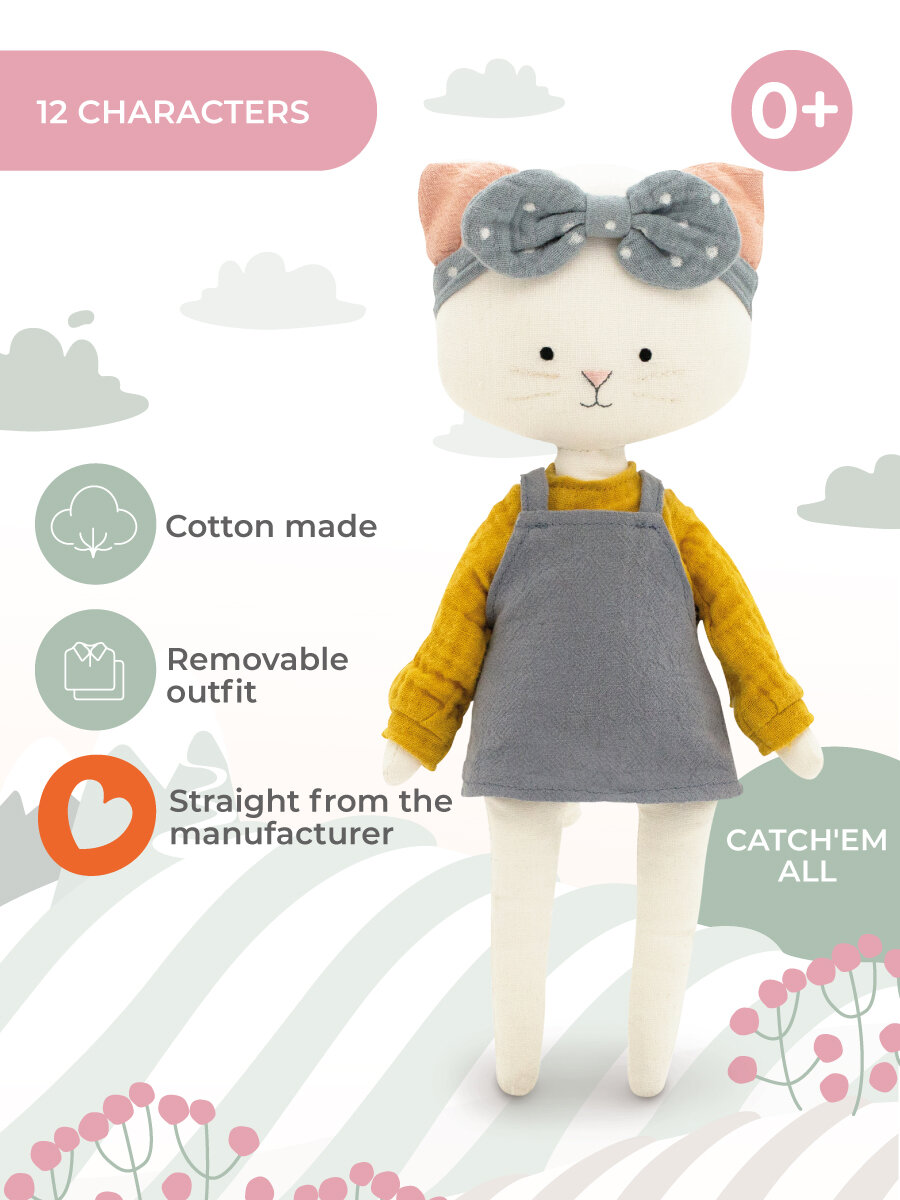 Kot Christy to urocza materiałowa maskotka o wysokości 30 cm z serii Cotti Motti od firmy Orange Toys, słynącej z europejskiego designu, wysokiej jakości i wyjątkowej estetyki. Stawy w ramionach i biodrach są przeszywane, dzięki temu maskotka może siedzieć. Głowy nie można obracać. Maskotka zapakowana jest w pudełko.