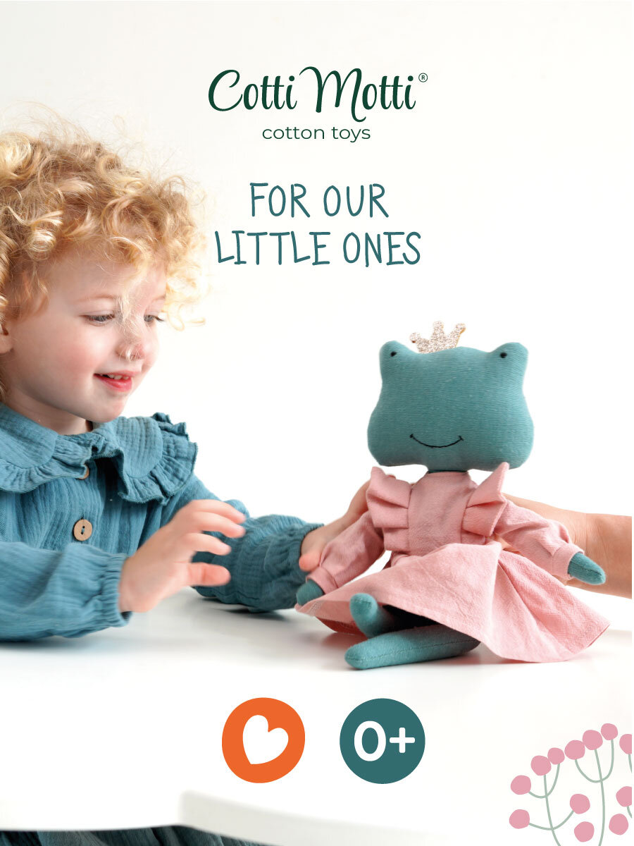 Żaba Fiona to urocza materiałowa maskotka o wysokości 30 cm z serii Cotti Motti od firmy Orange Toys, słynącej z europejskiego designu, wysokiej jakości i wyjątkowej estetyki. Stawy w ramionach i biodrach są przeszywane, dzięki temu maskotka może siedzieć. Głowy nie można obracać. Maskotka zapakowana jest w pudełko.