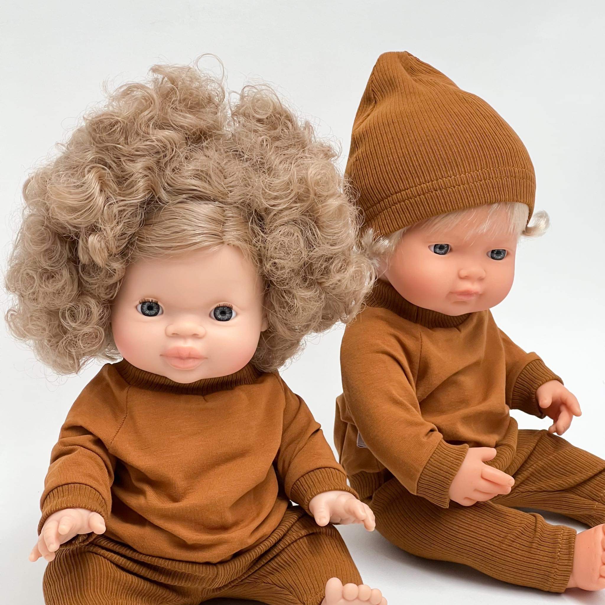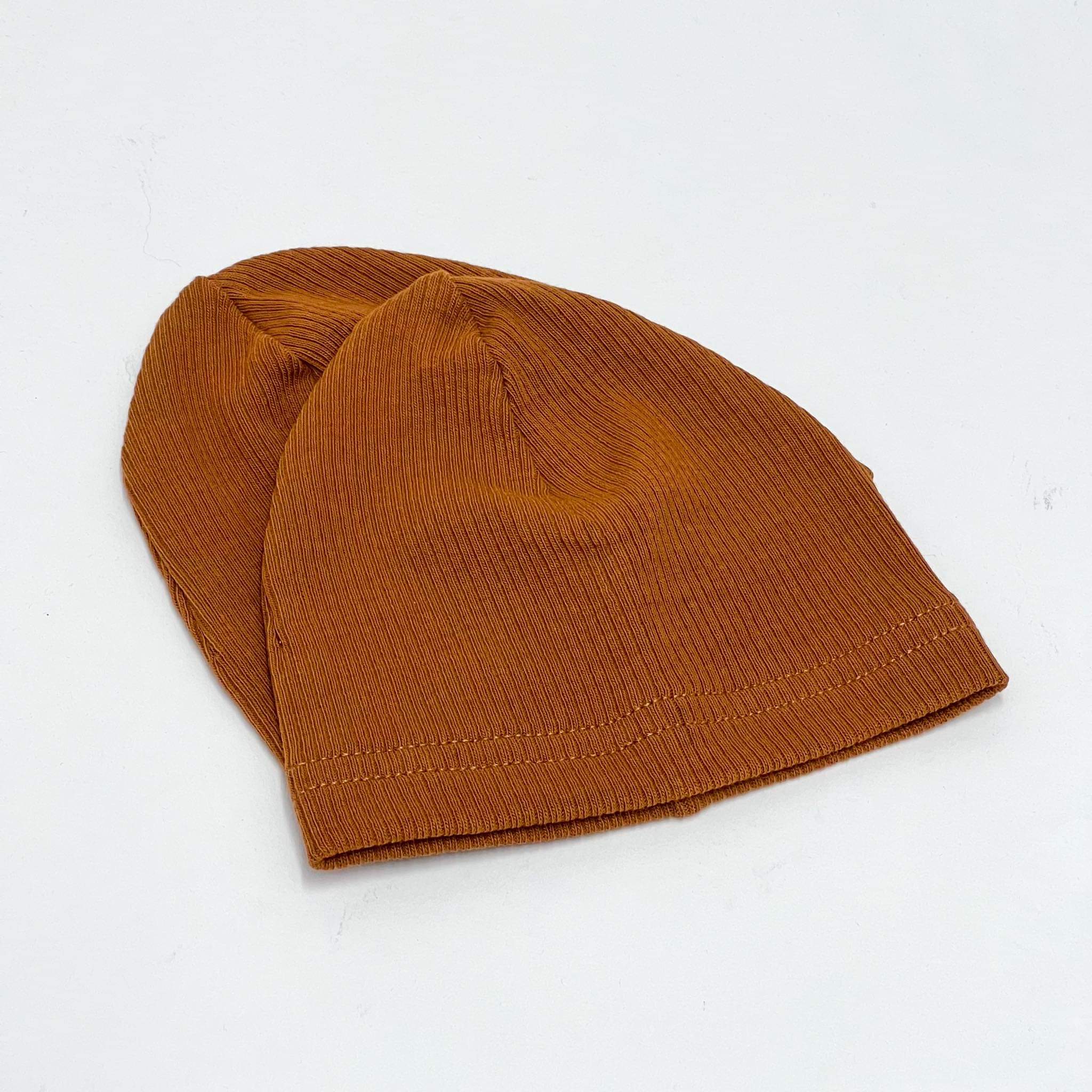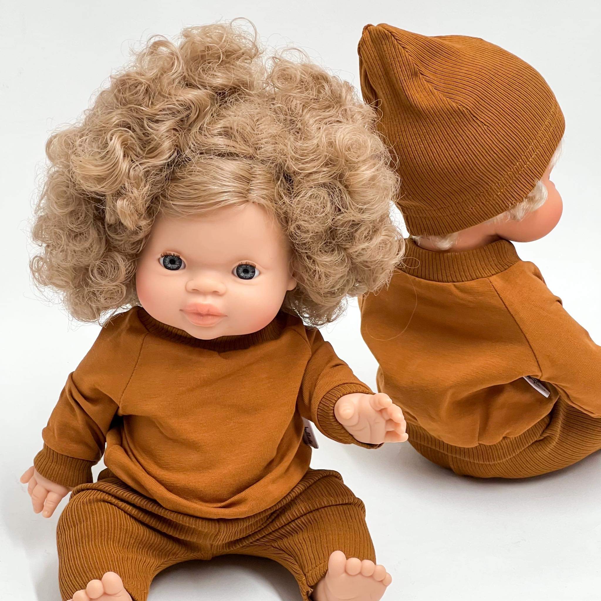 Czapeczka z dzianiny prążkowej w kolorze ciemnego cynamonu uszyta specjalnie dla hiszpańskich lalek Miniland 38 cm. Pasuje również na lalki Minikane 34 cm i lalki Paola Reina 34 cm.