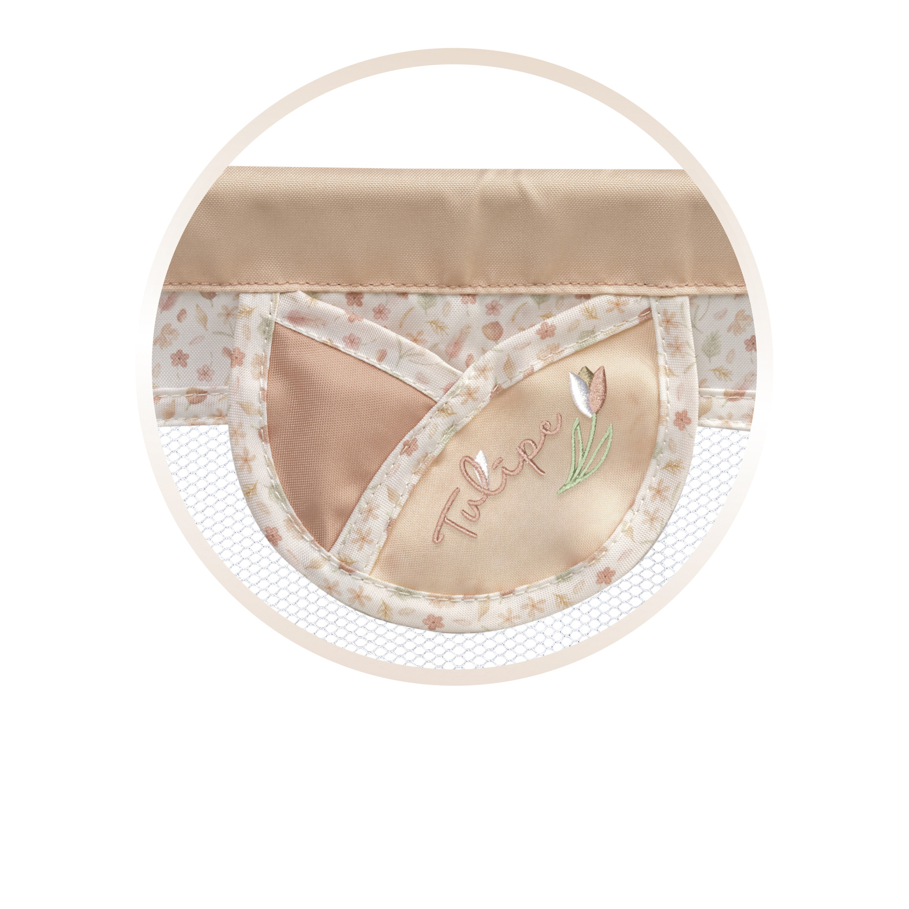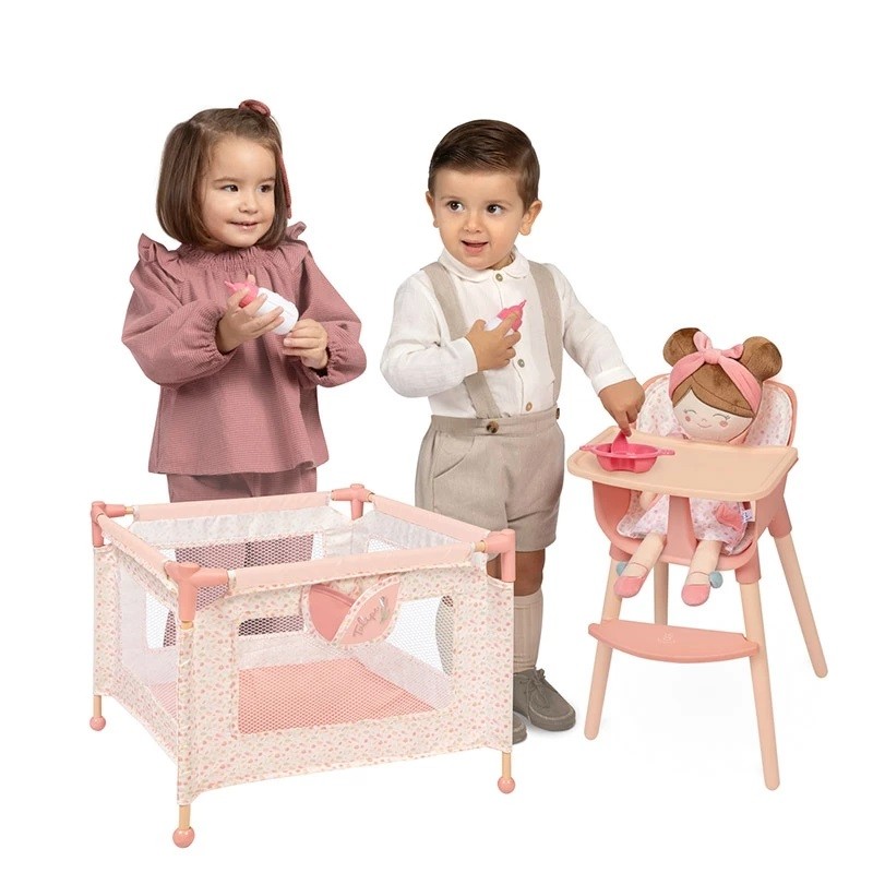 Piękny zestaw w pastelowych kolorach z serii Tulipe - krzesełko do karmienia i łóżeczko dla lalki. Łóżeczko ma z boku małą podręczną kieszonkę. Krzesełko ma wyjmowaną tackę do karmienia i pasy bezpieczeństwa.