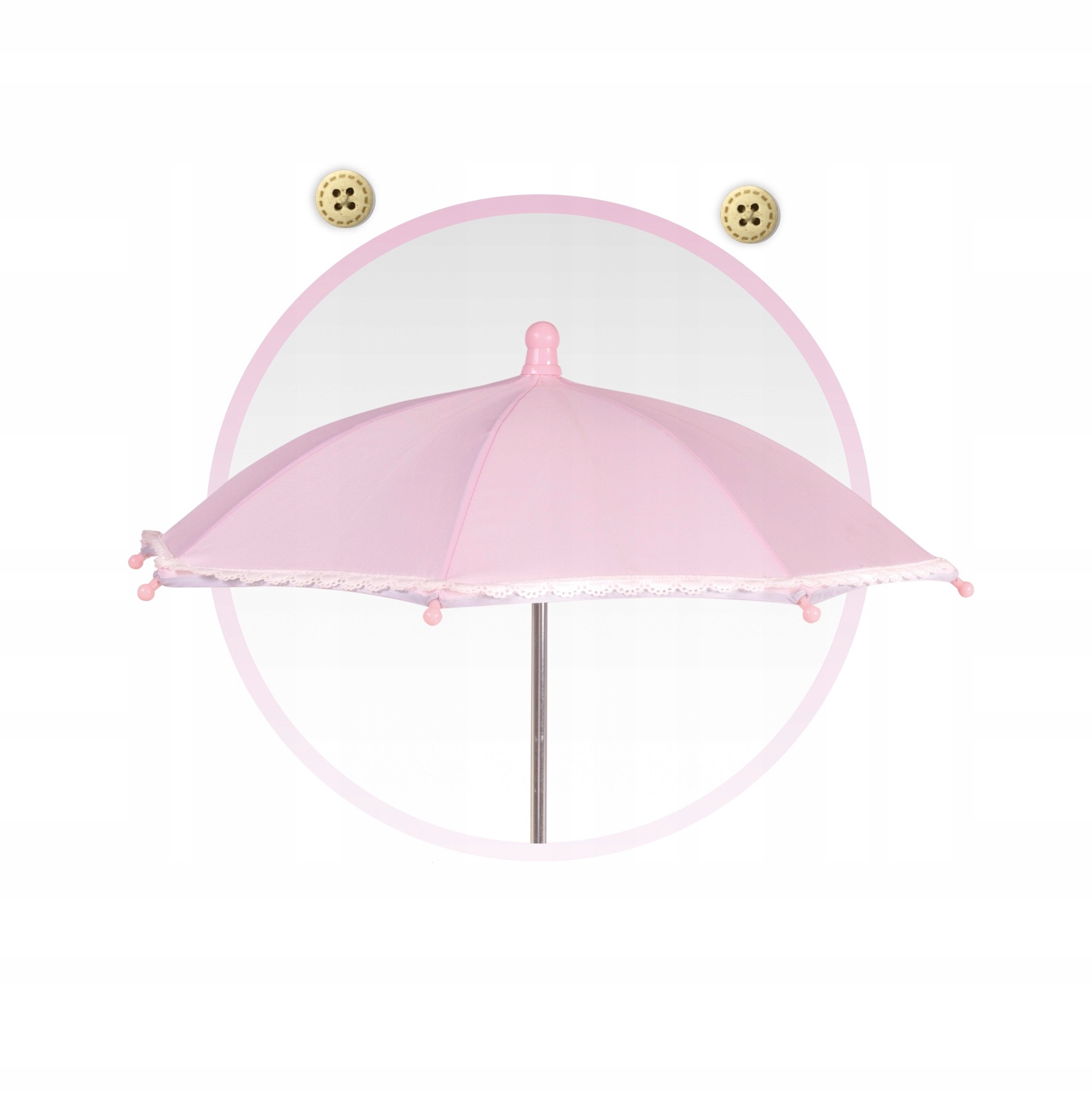 Wózek Sophie w pięknej różowej kolorystyce, z różową parasolką i różową torbą zawieszaną na rączce wózka. Jest lekki, bezpieczny i wygodny w użytkowaniu. Łatwo się składa.