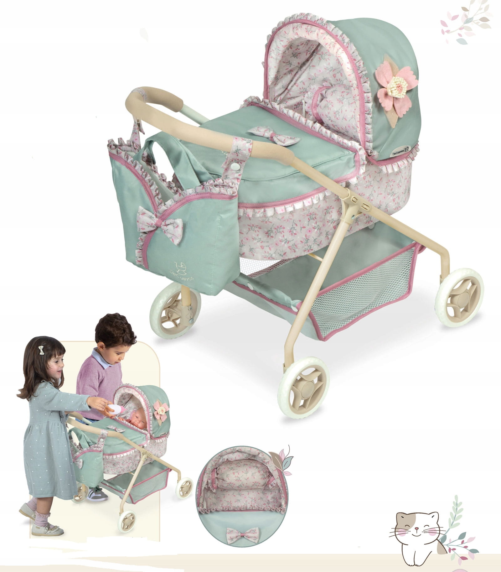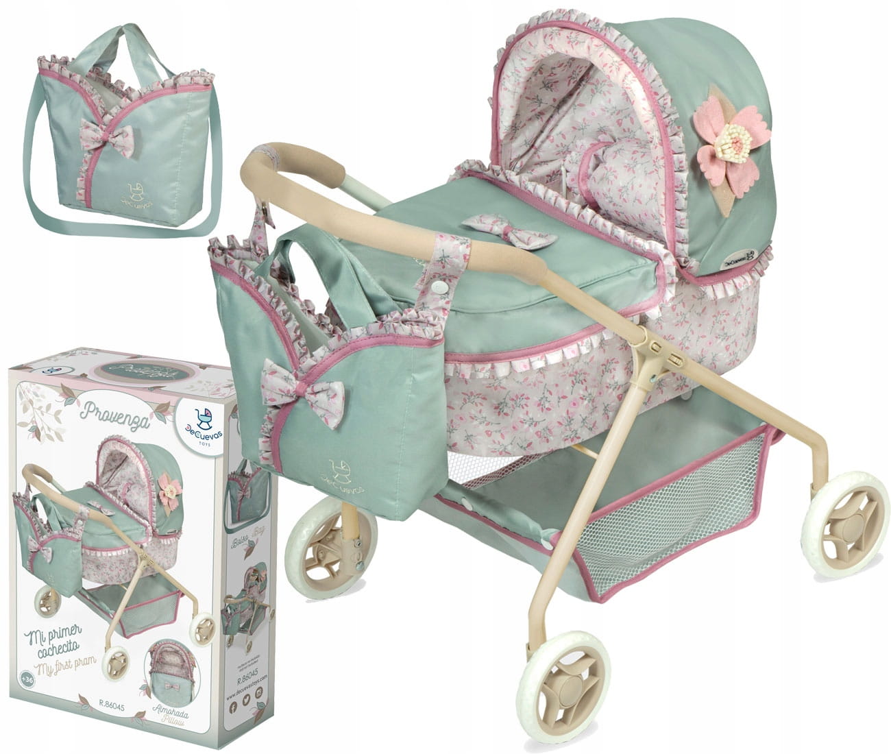 Model Provenza 86045 jest w pięknej kolorystyce mięty i różu z delikatnym wzorem kwiatowym. Do wózeczka można zabrać lalę i ukochane misie na długi spacer. Lekki, składany model jest łatwy w transporcie i wygodny w użytkowaniu.