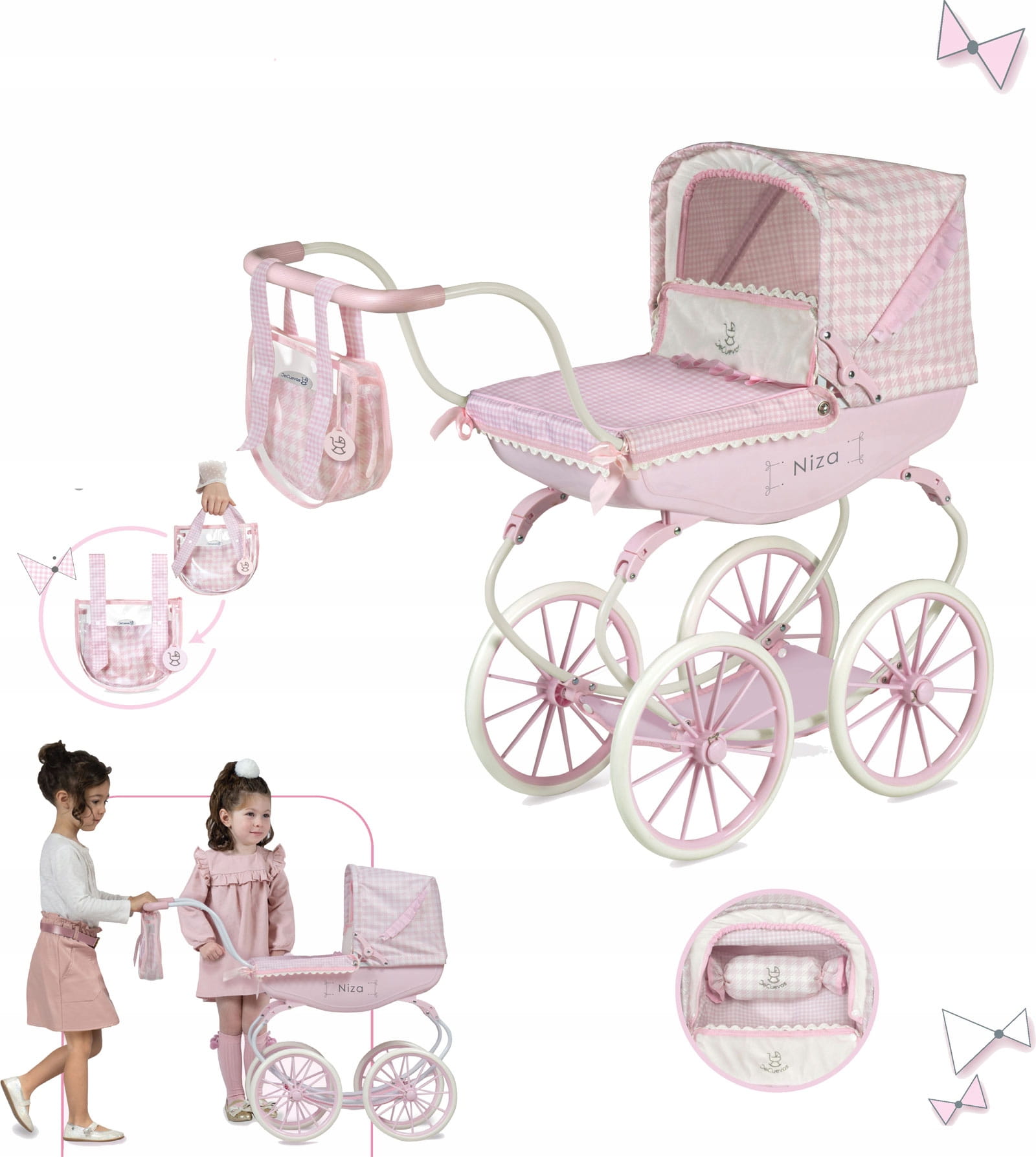 Oryginalnie zaprojektowany wózek Niza z dużymi kołami w stylu retro wyróżnia się delikatną biało-różową kolorystyką oraz ponadczasowym wzorem w kratkę. Do wózeczka można włożyć ukochane misie i lalki i zabrać je na długi spacer. Lekki, składany model jest łatwy w transporcie i wygodny w użytkowaniu.