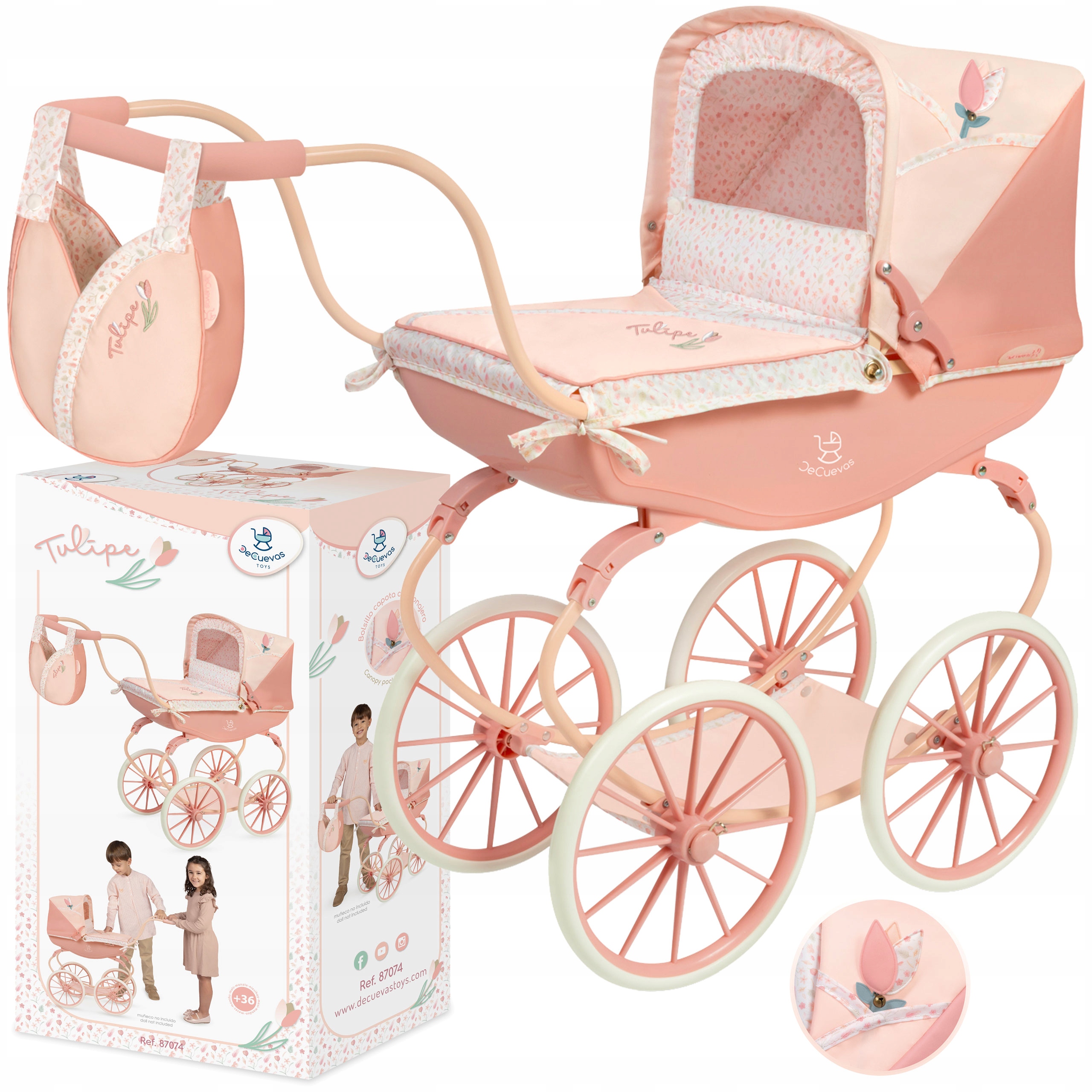 Oryginalnie zaprojektowany wózek dla lalki z dużymi kołami w stylu retro to jedna z propozycji z pięknej kolekcji Tulipe od renomowanej hiszpańskiej marki DeCuevas. Lekki, składany model jest łatwy w transporcie i wygodny w użytkowaniu.