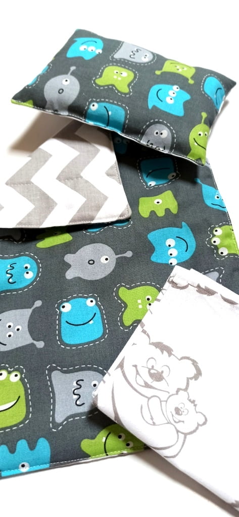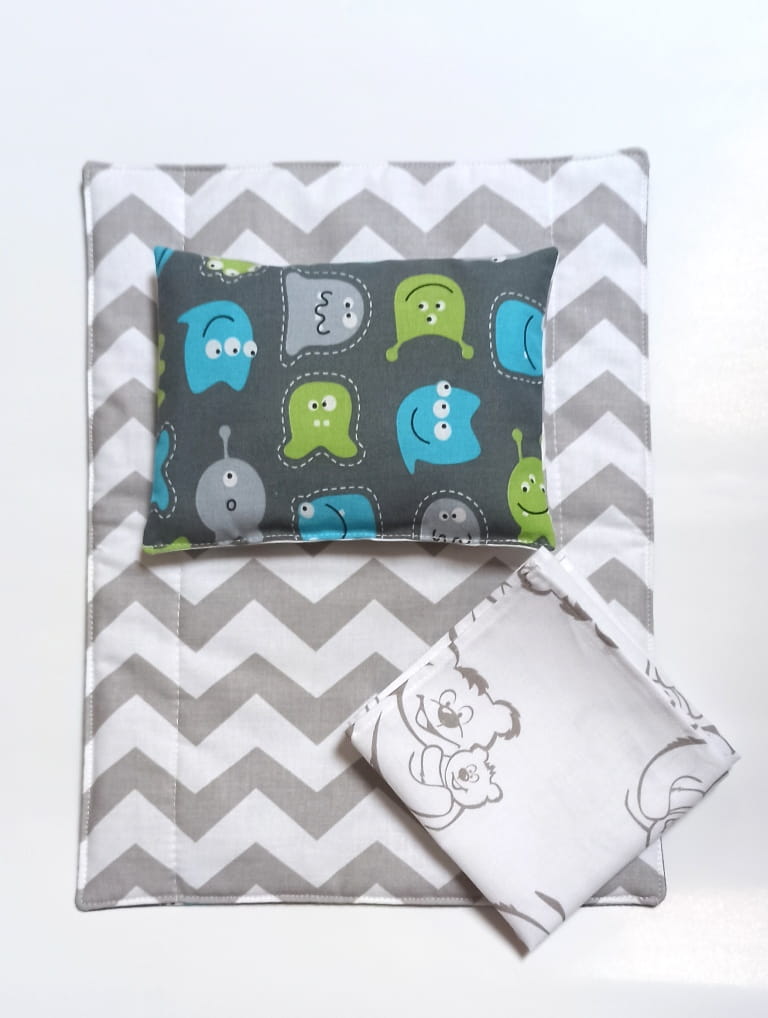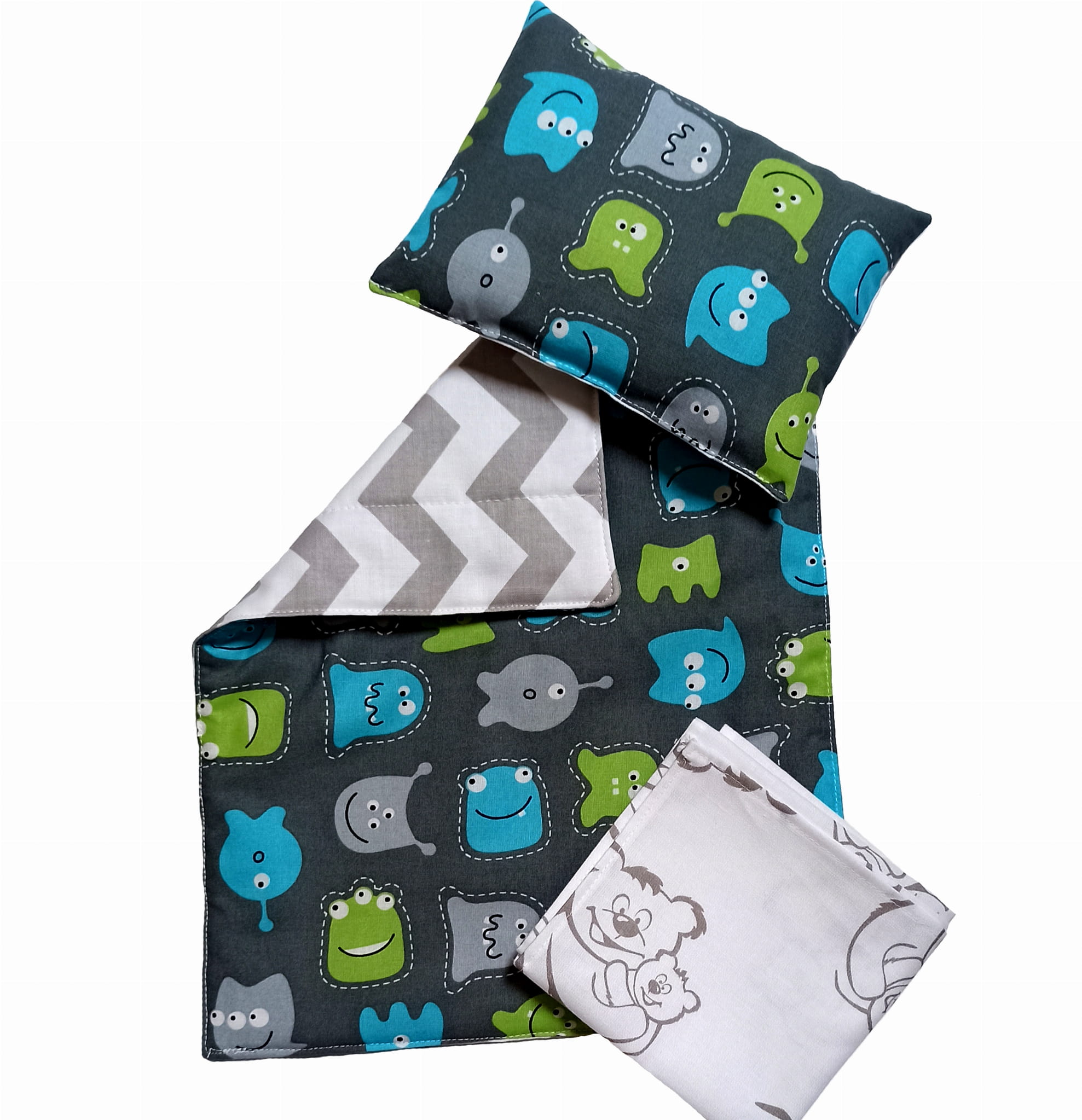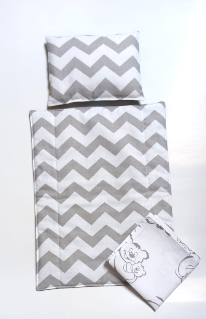 Poduszka i kołderka uszyta z tkaniny w duszki i zygzaki, prześcieradło z tkaniny w misie.