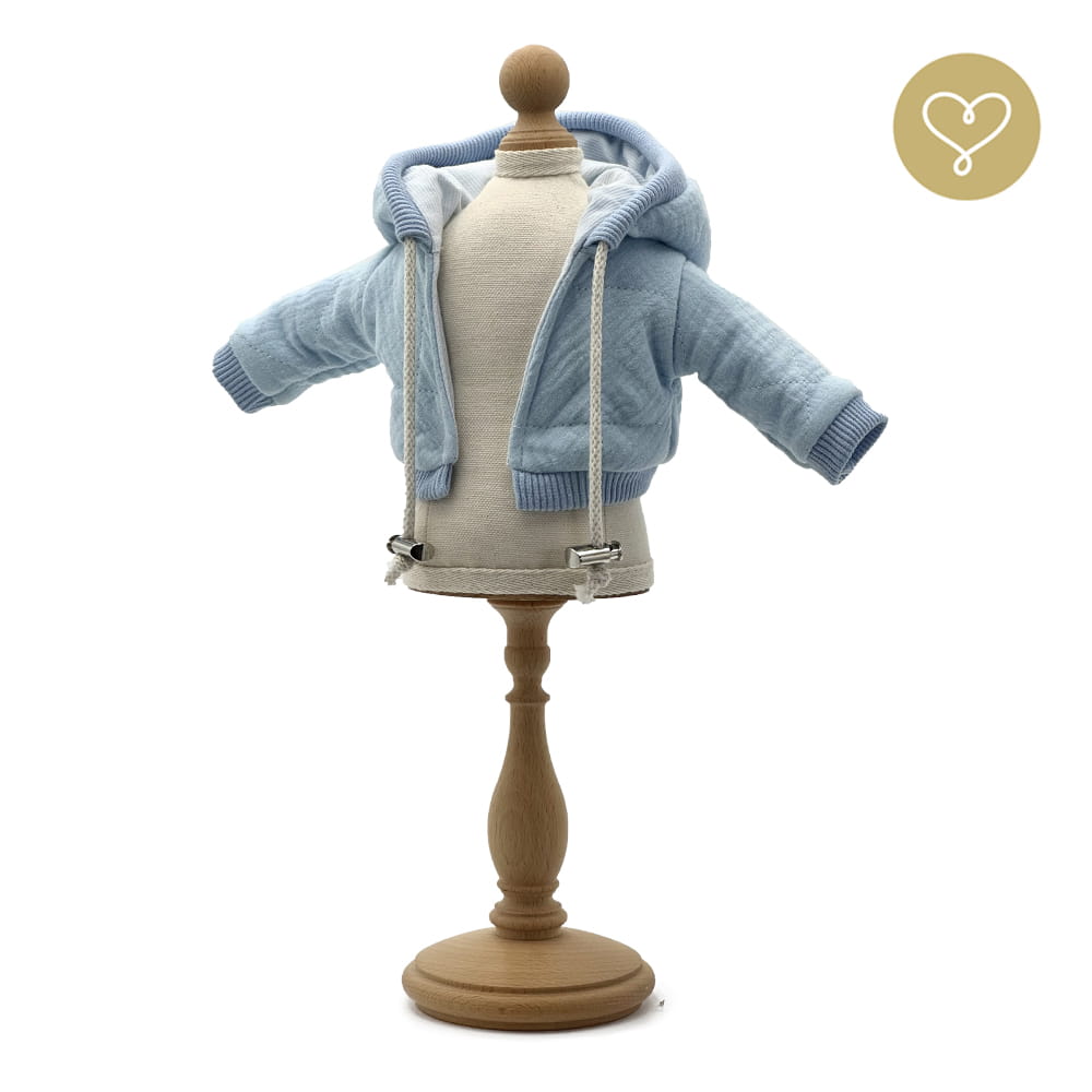 Jasnoniebieska kurtka wykonana z pikówki z podszewką i ze ściągaczami, przy kapturze metalowe stopery