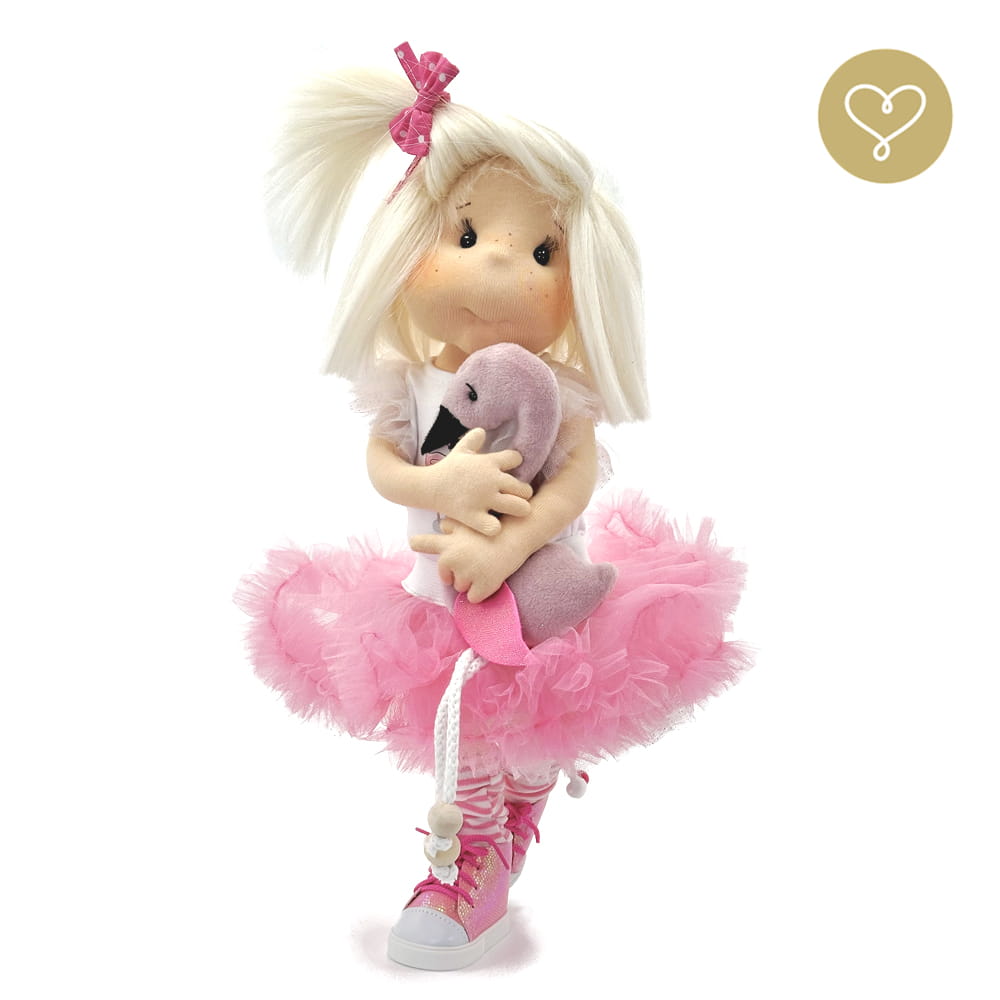 Florka to wyjątkowa materiałowa lalka stworzona z pasją i dbałością o każdy szczegół. Ma około 38 cm wzrostu. Uszyta jest z najwyższej jakości trykotu bawełnianego i wypełniona owatą poliestrową. Laleczka ubrana jest w bluzeczkę z aplikacją flaminga, różową spódniczkę tutu, getry w paseczki i buciki. Na szczególną uwagę zasługują włosy lalki: są z naturalnej Alpaki, uznawanej za najlepszy materiał w profesjonalnym lalkarstwie. W odróżnieniu od włosów syntetycznych można je kręcić lokówką, prostować prostownicą, nie zawierają lanoliny, są antyalergiczne, nie chłoną łatwo wilgoci i mniej się elektryzują. Dzięki temu włosy można czesać i stylizować, tworząc różnorodne fryzury. Laleczce towarzyszy Flaming.