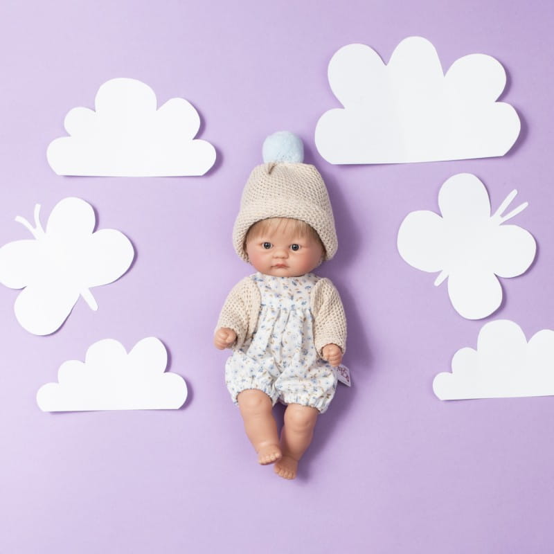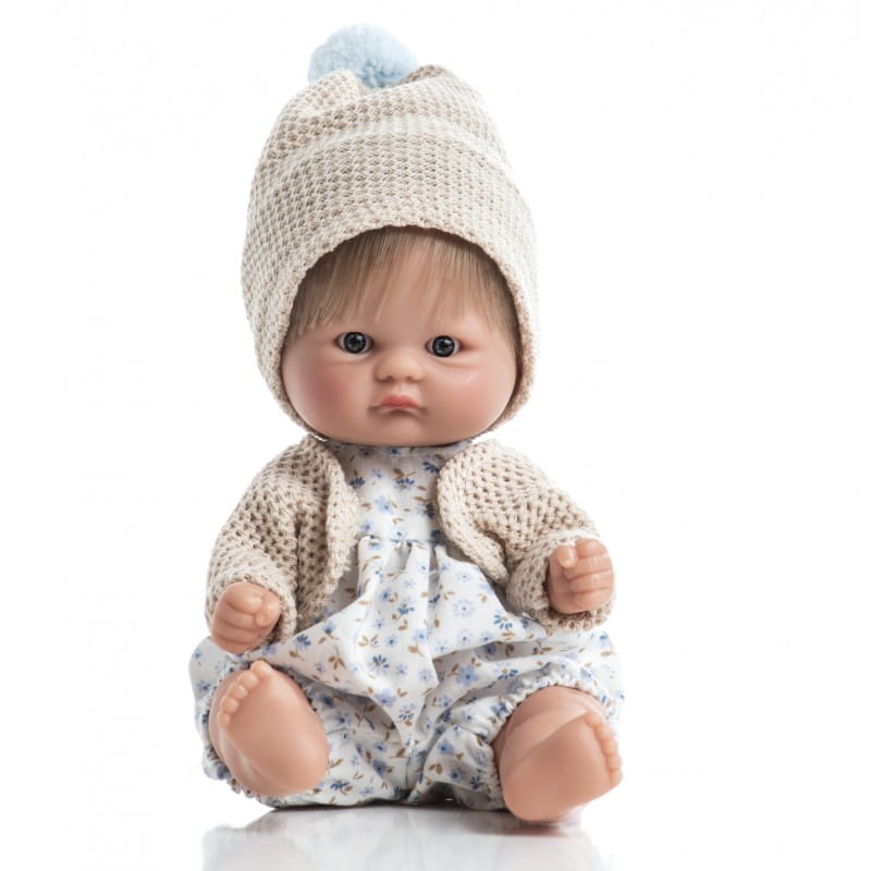 BOMBONCIN - to urocza mała laleczka. Ze względu na niewielki rozmiar (20 cm) można ją zawsze mieć przy sobie. Nie ma zaznaczonej płci. W zależności od wyglądu i ubranka może odgrywać rolę dziewczynki lub chłopca. W całości wykonana jest z przyjemnego w dotyku winylu. Ma ruchome rączki, nóżki i głowę. Siedzi samodzielnie.
