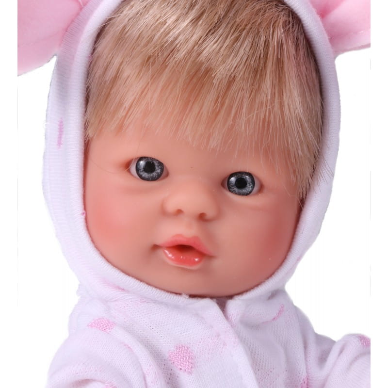 BOMBONCIN - to urocza mała laleczka. Ze względu na niewielki rozmiar (20 cm) można ją zawsze mieć przy sobie. Nie ma zaznaczonej płci. W zależności od wyglądu i ubranka może odgrywać rolę dziewczynki lub chłopca. W całości wykonana jest z przyjemnego w dotyku winylu. Ma ruchome rączki, nóżki i głowę. Siedzi samodzielnie.