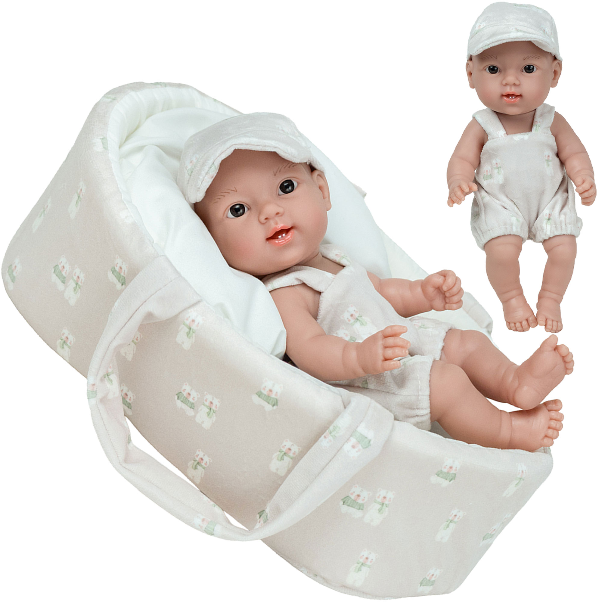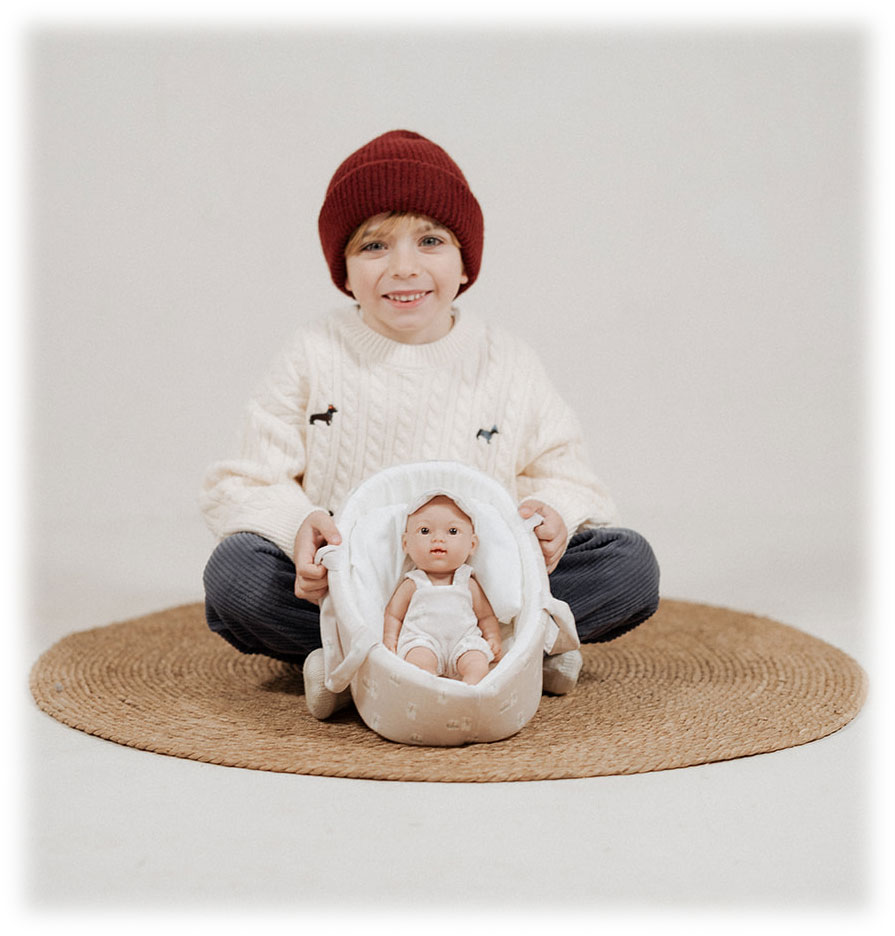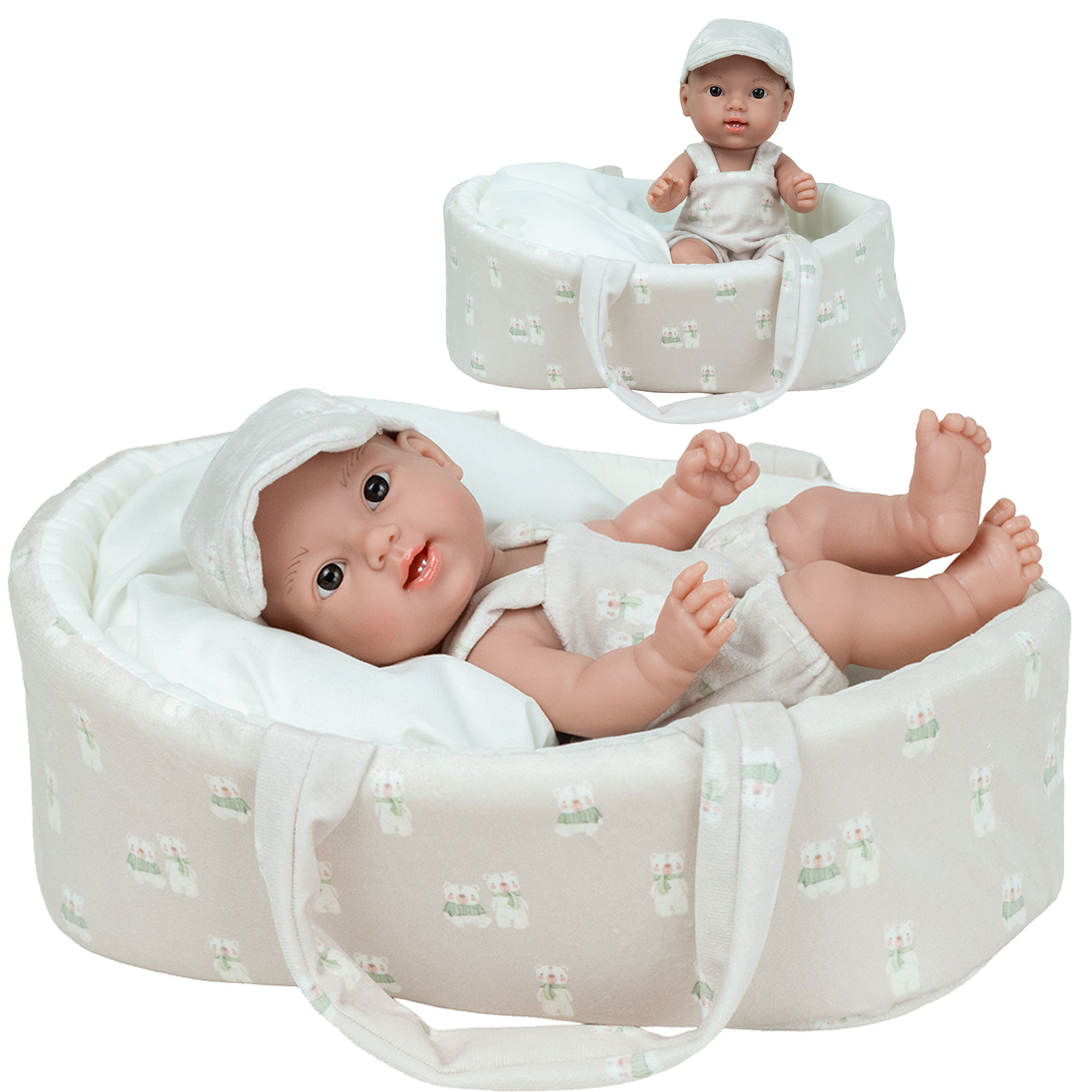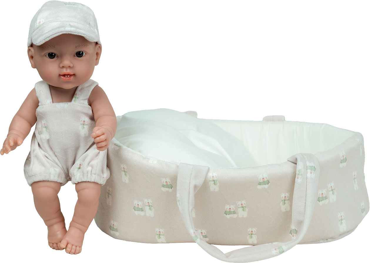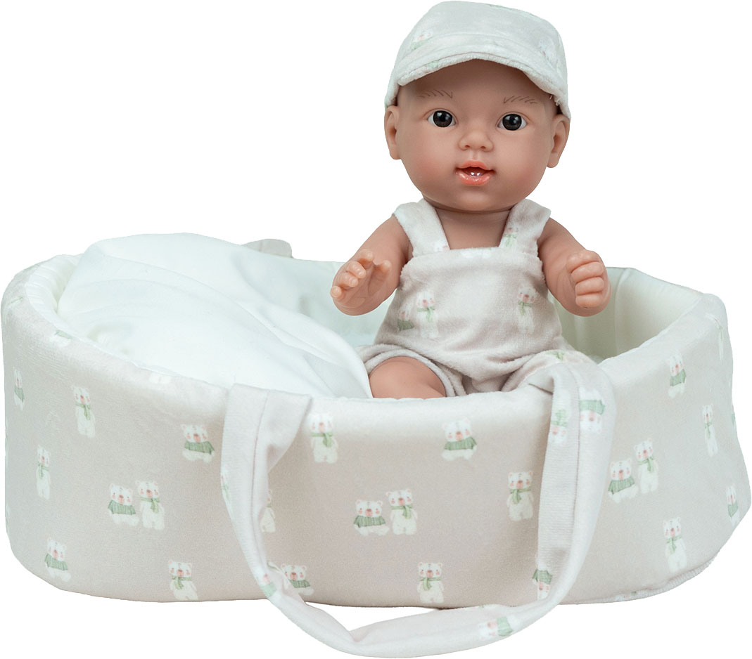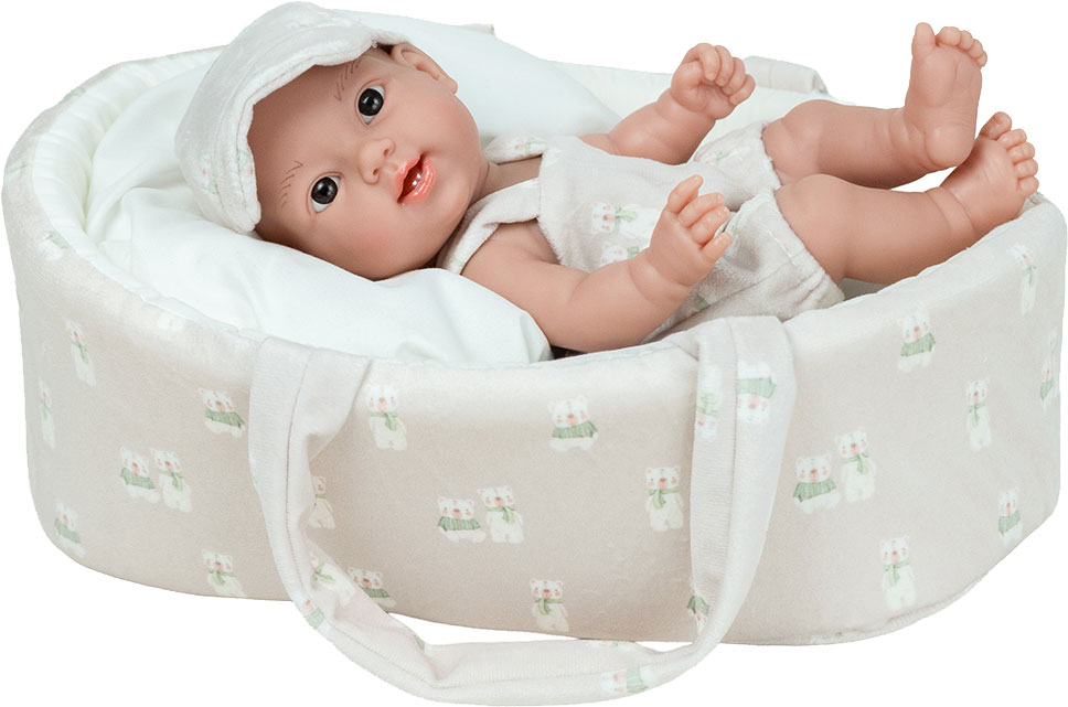 Ta urocza 26 cm laleczka bobasek idealnie pasuje do małych rączek dziecka. W całości wykonana jest z przyjemnego w dotyku winylu. Nie ma zaznaczonej płci i w zależności od ubranka może odgrywać rolę dziewczynki lub chłopca. Na główce ma rzeźbienia imitujące krótkie włoski noworodka. Ma ruchome rączki, nóżki i głowę, dzięki temu może zmieniać pozycje i samodzielnie siedzieć. Zaznaczone fałdki na skórze i linie papilarne sprawiają, że laleczka wygląda jak prawdziwe niemowlę.