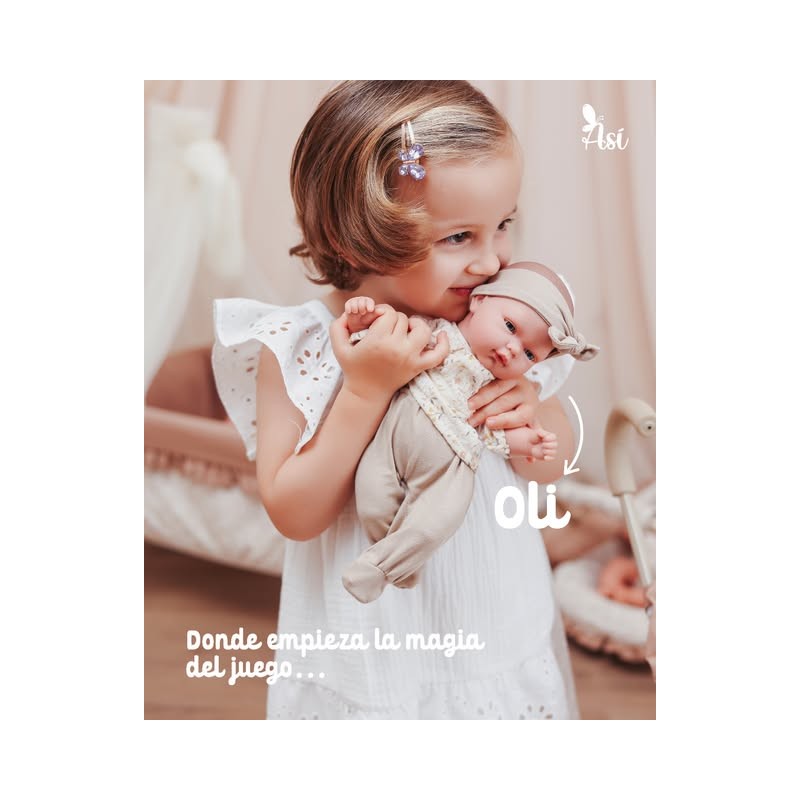OLI - to słodka laleczka bobasek. Głowa, rączki i nóżki wykonane są z gładkiego i przyjemnego w dotyku winylu. Ruchome w stawach, dzięki temu lalka może przybierać różne pozycje. Brzuszek uszyty jest z materiału i wypełniony miękką wyściółką. Na główce ma rzeźbienia, które przypominają krótkie włoski noworodka. W zależności od ubranka może odgrywać rolę dziewczynki lub chłopca.