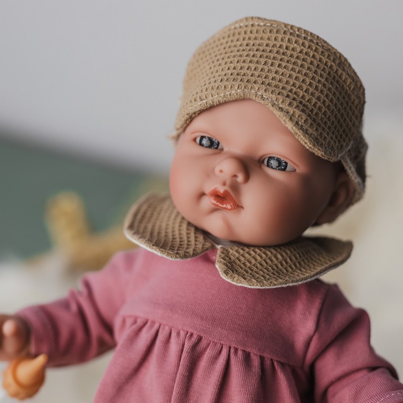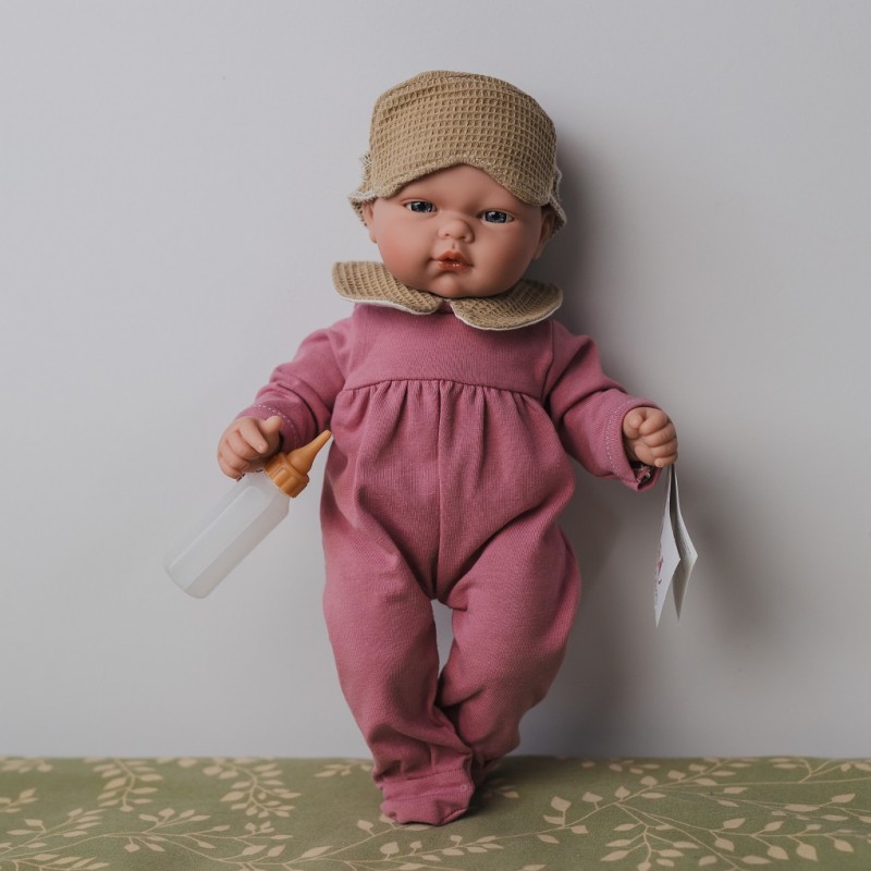 OLI - to słodka laleczka bobasek. Głowa, rączki i nóżki wykonane są z gładkiego i przyjemnego w dotyku winylu. Ruchome w stawach, dzięki temu lalka może przybierać różne pozycje. Brzuszek uszyty jest z materiału i wypełniony miękką wyściółką. Na główce ma rzeźbienia, które przypominają krótkie włoski noworodka. W zależności od ubranka może odgrywać rolę dziewczynki lub chłopca.