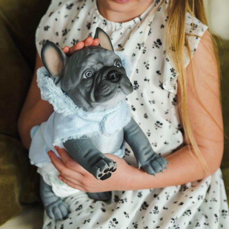 NONO - uroczy piesek rasy buldog francuski z serii Animal Reborn. W całości wykonana jest z przyjemnego w dotyku, miękkiego, pachnącego wanilią winylu. Zaznaczone fałdki na skórze, linie papilarne, rzeźbienia imitujące sierść na ciele powodują, że piesek wygląda bardzo realistcznie. Ma ruchome rączki, nóżki i głowę. Siedzi samodzielnie.