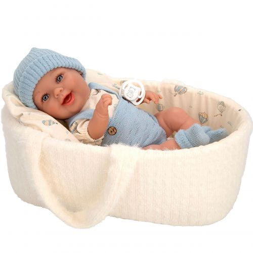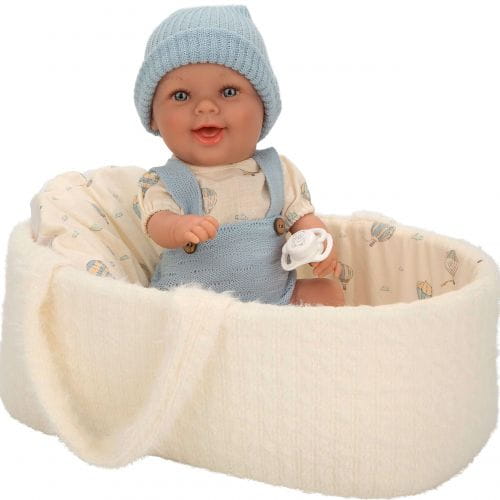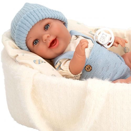Niezwykle urocza i uśmiechnięta laleczka w ubranku i nosidełko to idealny, kompletny prezent dla małej dziewczynki. W całości wykonana jest z przyjemnego w dotyku winylu. Laleczka ma zaznaczoną płeć - jest chłopczykiem. Rzeźbienia na główce imitujące krótkie włoski noworodka, zaznaczone fałdki na skórze i linie papilarne sprawiają, że laleczka wygląda jak prawdziwe niemowlę. Ma ruchome rączki, nóżki i głowę, dzięki temu może zmieniać pozycje i samodzielnie siedzieć.