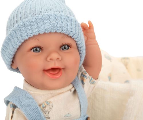 Niezwykle urocza i uśmiechnięta laleczka w ubranku i nosidełko to idealny, kompletny prezent dla małej dziewczynki. W całości wykonana jest z przyjemnego w dotyku winylu. Laleczka ma zaznaczoną płeć - jest chłopczykiem. Rzeźbienia na główce imitujące krótkie włoski noworodka, zaznaczone fałdki na skórze i linie papilarne oraz widoczne dwa ząbki sprawiają, że laleczka wygląda jak prawdziwe niemowlę. Ma ruchome rączki, nóżki i głowę, dzięki temu może zmieniać pozycje i samodzielnie siedzieć.