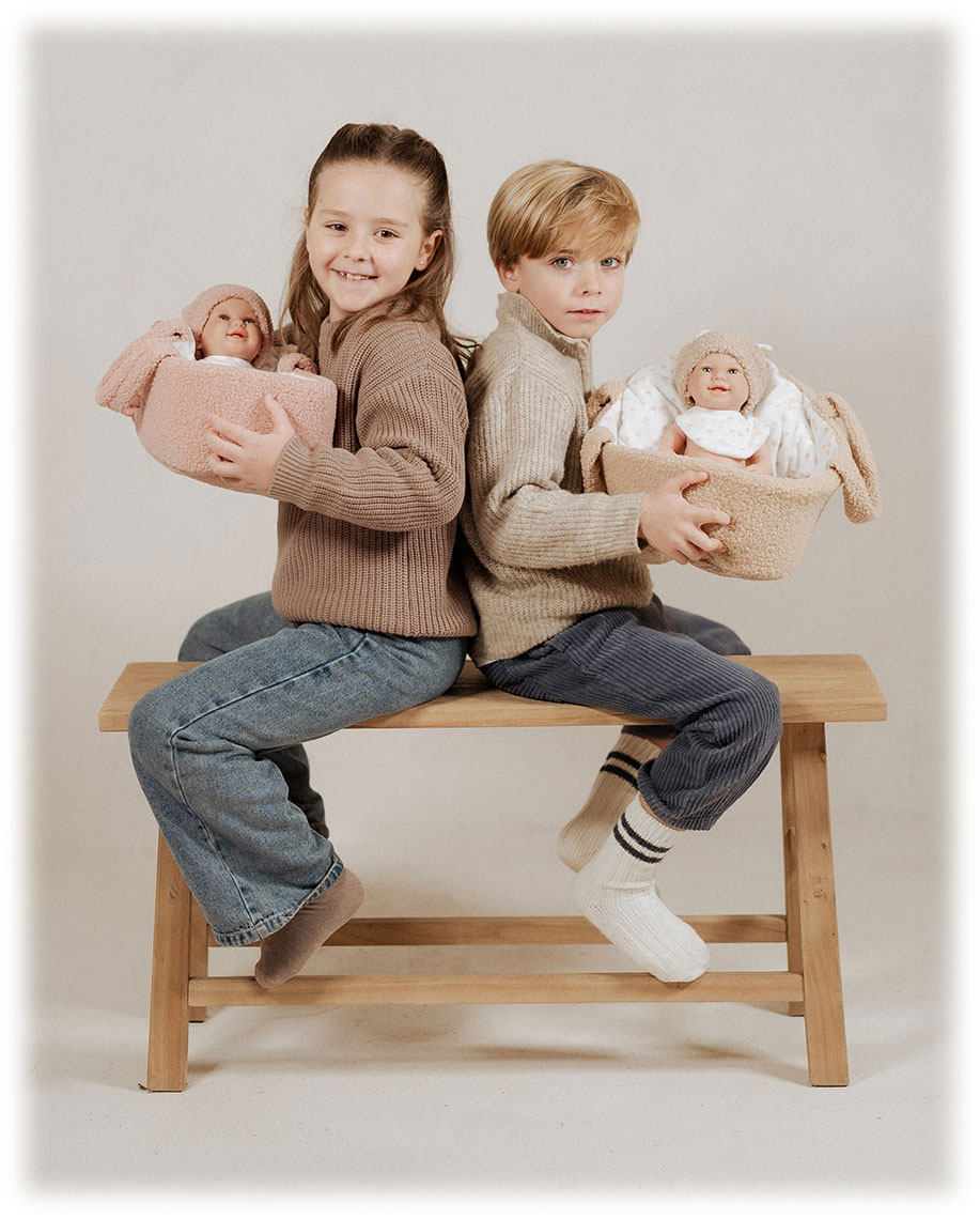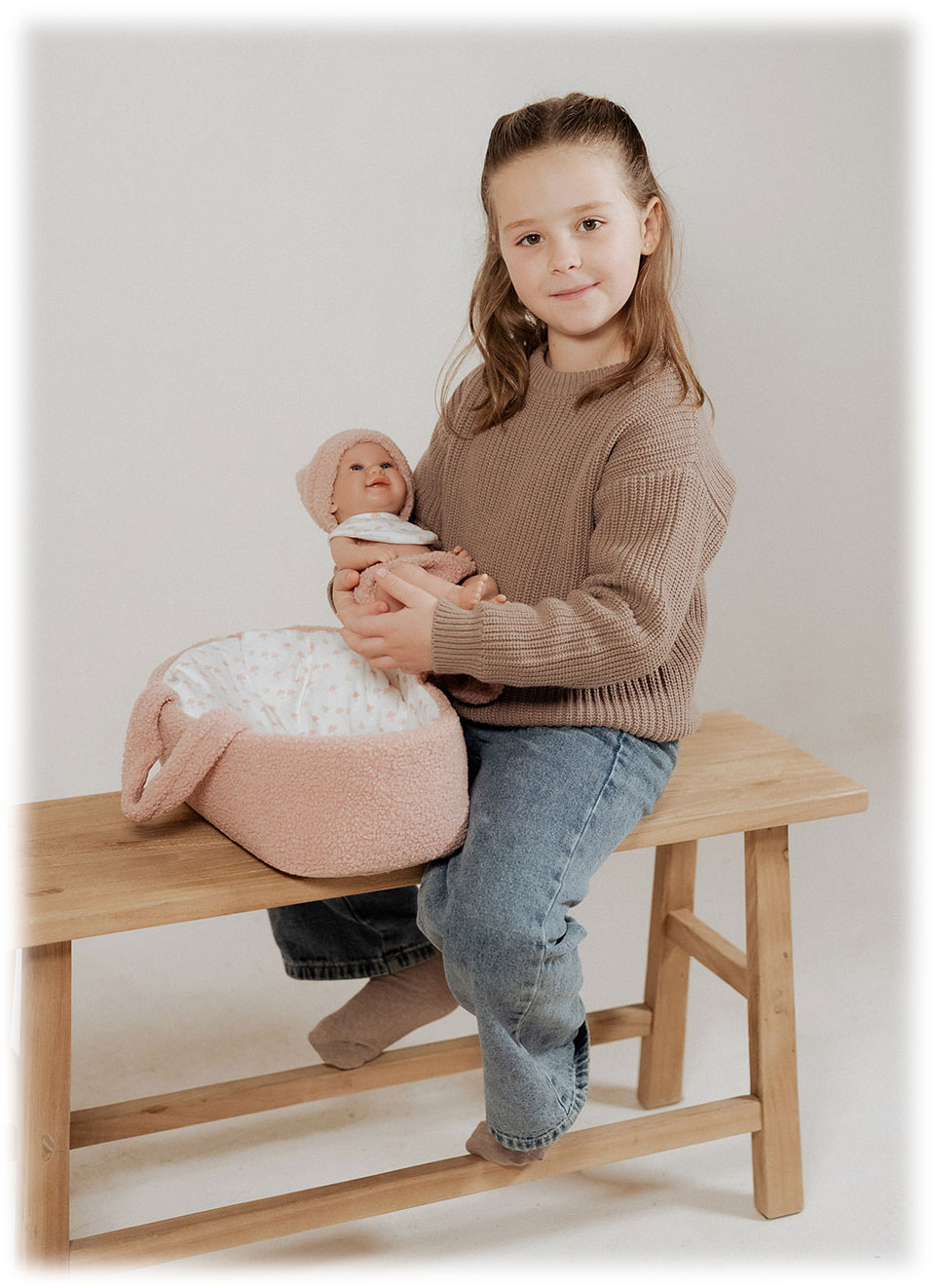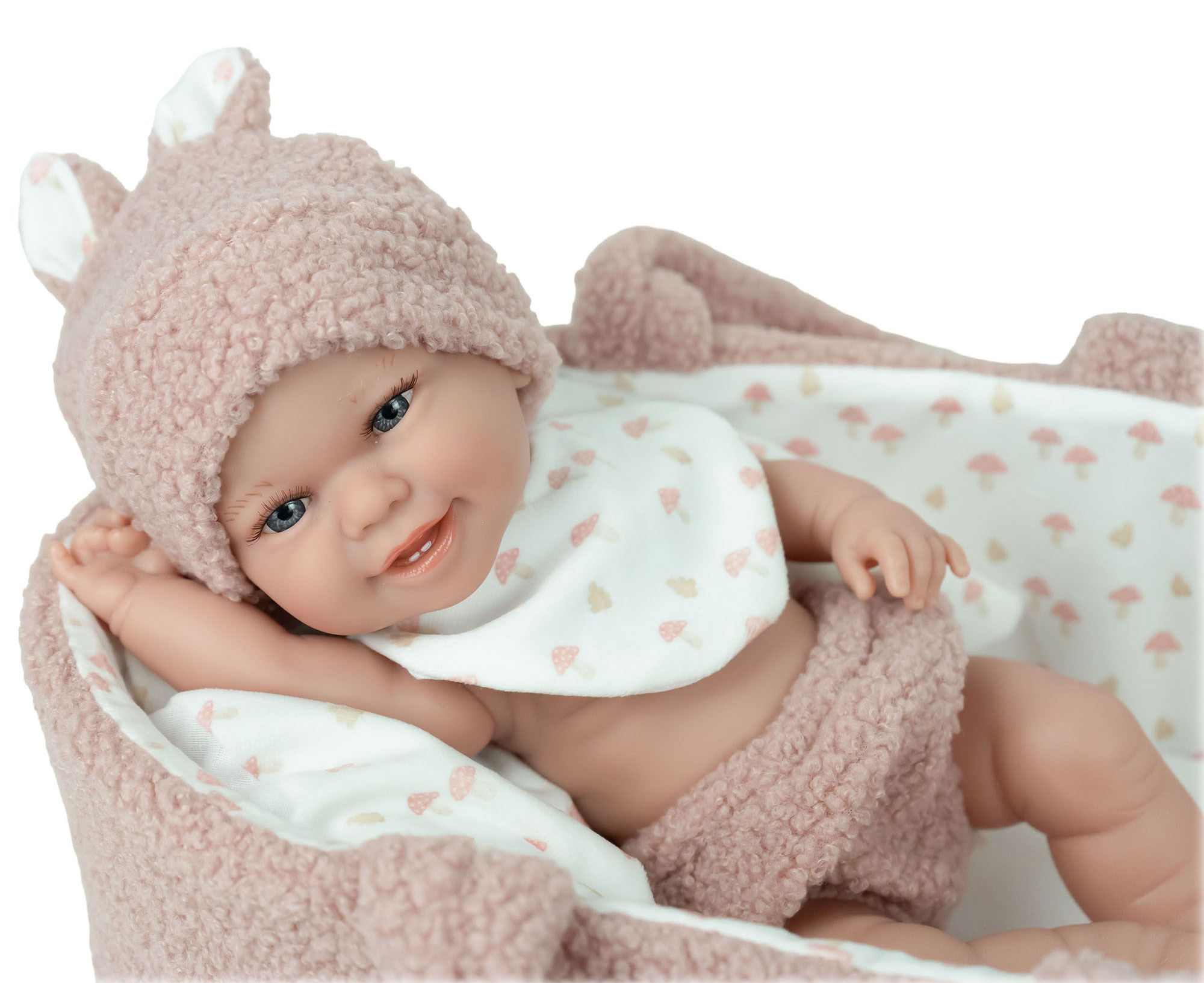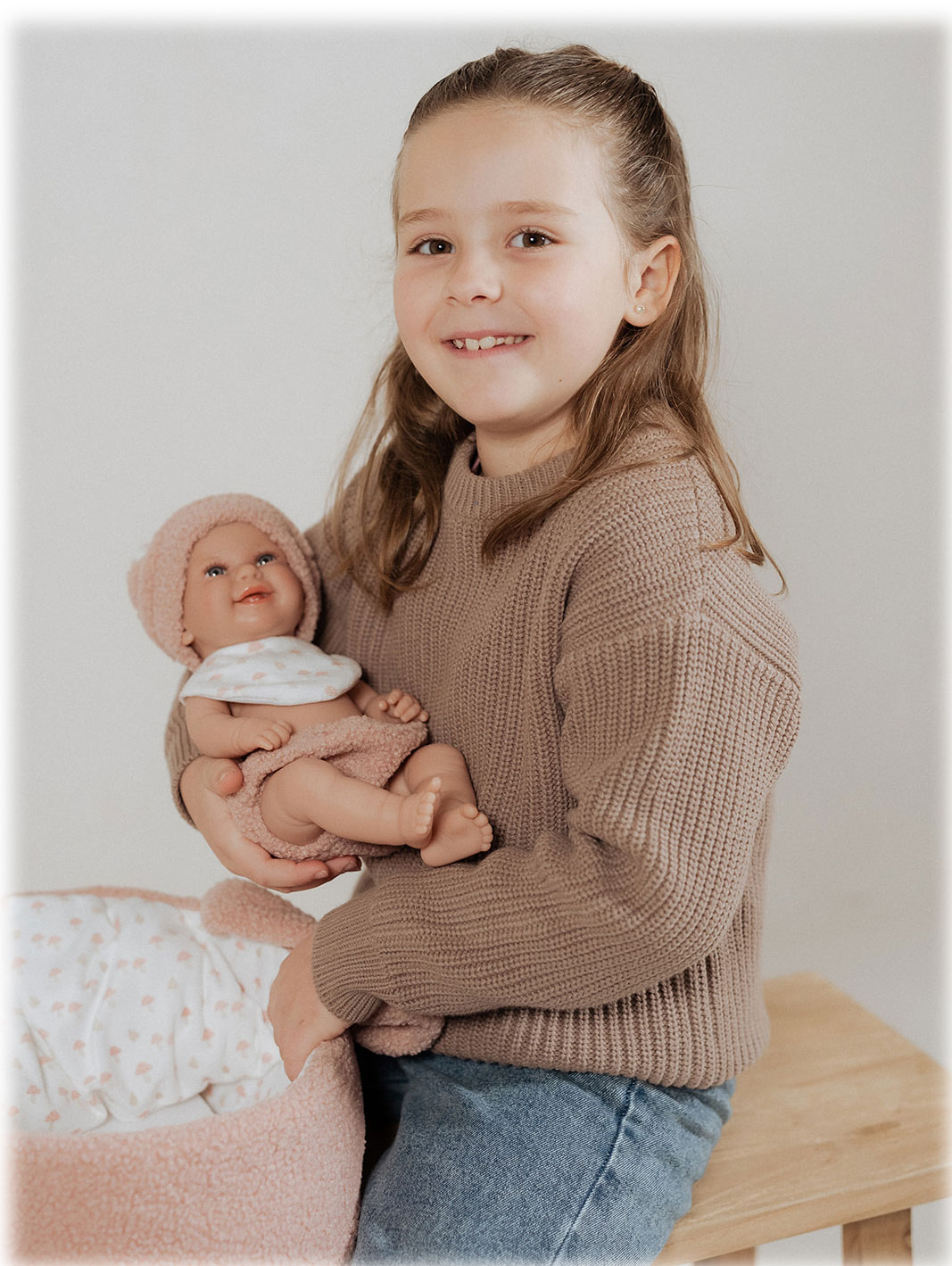 Niezwykle urocza i uśmiechnięta laleczka w ubranku i nosidełko to idealny, kompletny prezent dla małej dziewczynki. W całości wykonana jest z przyjemnego w dotyku winylu. Laleczka ma zaznaczoną płeć - jest dziewczynką. Rzeźbienia na główce imitujące krótkie włoski noworodka, zaznaczone fałdki na skórze i linie papilarne oraz widoczne dwa ząbki sprawiają, że laleczka wygląda jak prawdziwe niemowlę. Ma ruchome rączki, nóżki i głowę, dzięki temu może zmieniać pozycje i samodzielnie siedzieć.