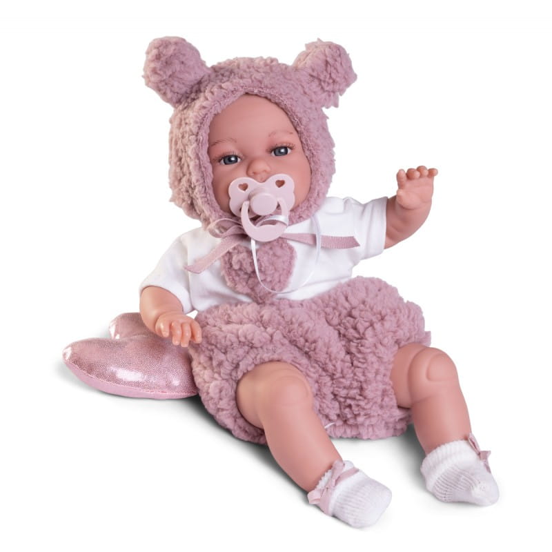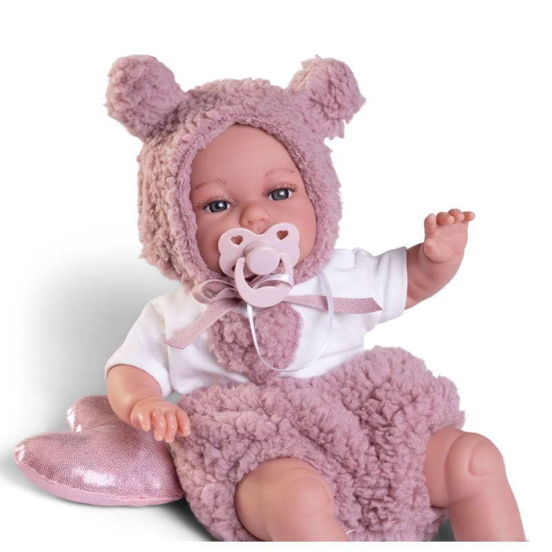 TONETA POSTURITAS - to niezwykle uroczy bobasek o pogodnej twarzy. Głowa, rączki i nóżki wykonane są z przyjemnego w dotyku winylu. Brzuszek uszyty jest z materiału i wypełniony miękką wyściółką. Na główce ma rzeźbienia, które przypominają krótkie włoski noworodka. W zależności od ubranka lalka może odgrywać rolę dziewczynki lub chłopca. Lalka posiada w ciele stelaż, dzięki któremu może samodzielnie siedzieć i przyjąć różne pozy.