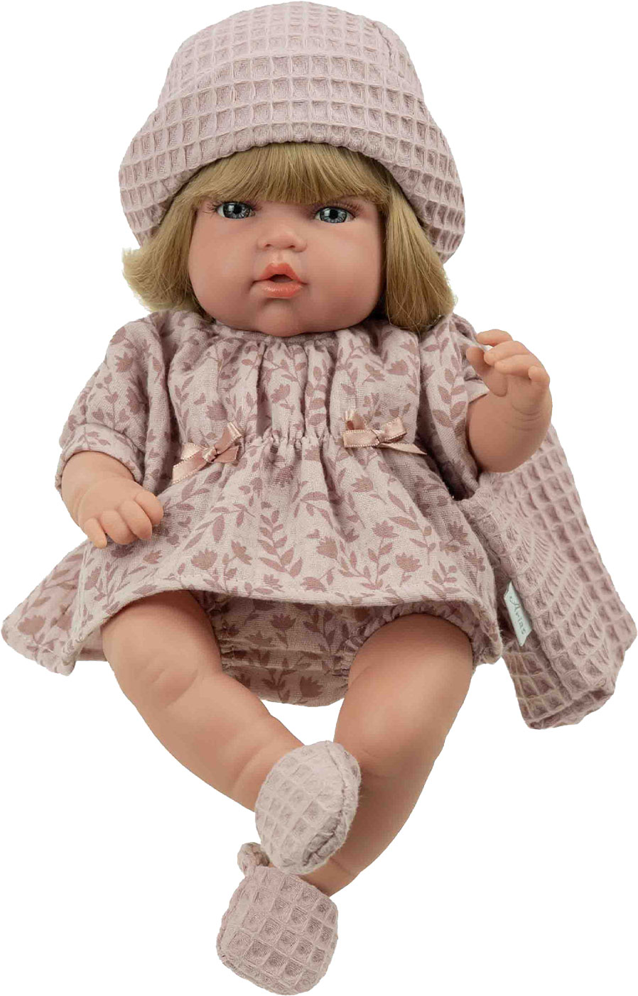 Urocza laleczka w eleganckim pudełku to idealny prezent dla małej dziewczynki. Laleczka ma blond włosy z grzywką, rzęsy, zaznaczone fałdki i linie papilarne. Głowa, rączki i nóżki wykonane są z gładkiego i przyjemnego w dotyku winylu. Brzuszek uszyty jest z materiału i wypełniony miękką wyściółką.