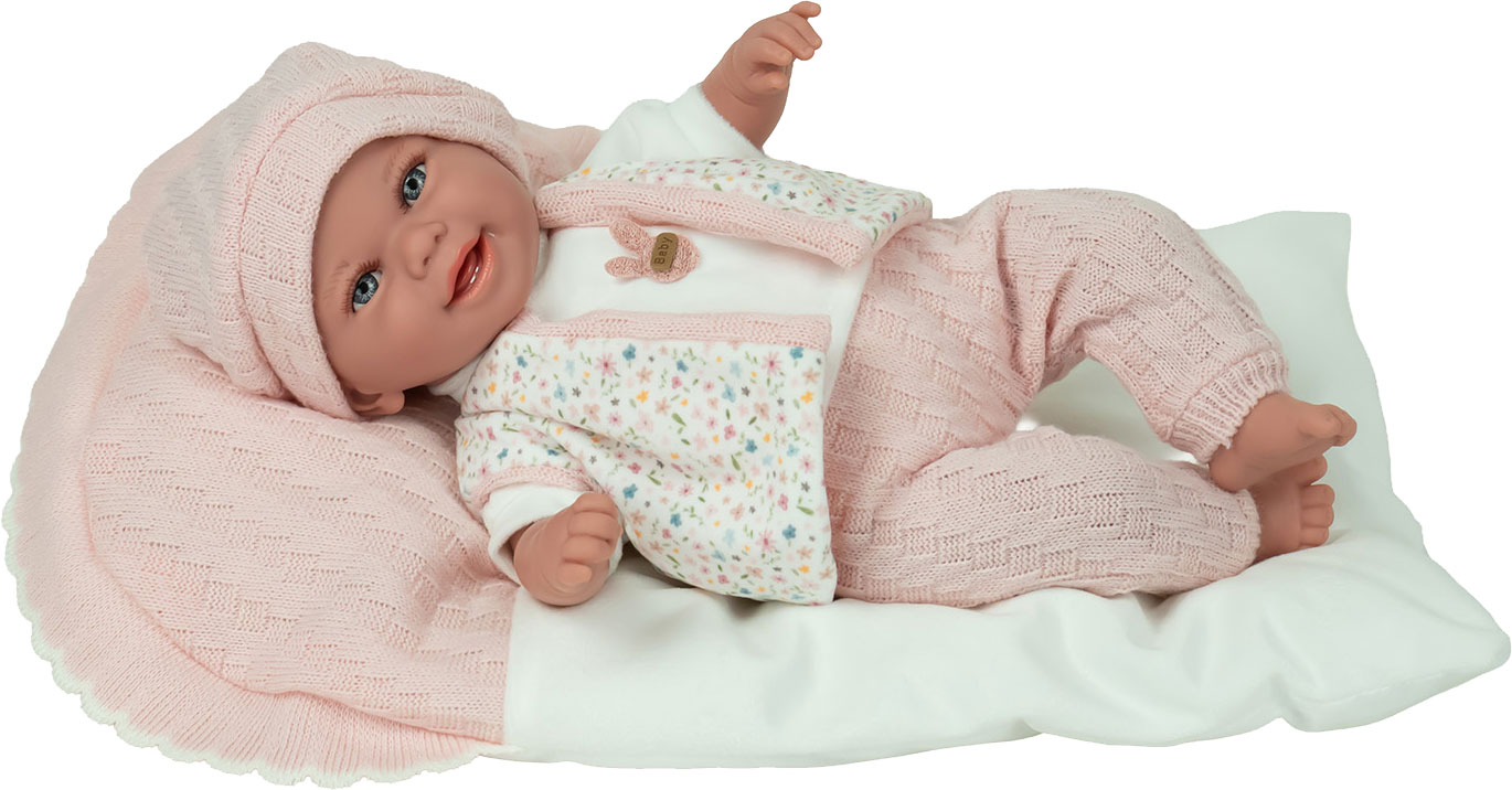 Niezwykle urocza i uśmiechnięta laleczka w ubranku w eleganckim pudełku to idealny prezent dla małej dziewczynki. Rzeźbienia na główce imitujące krótkie włoski noworodka, zaznaczone fałdki na skórze i linie papilarne, piękne rzęsy, widoczne dwa ząbki, namalowana ślinka w kąciku ust oraz katarek w nosku sprawiają, że laleczka wygląda jak prawdziwe niemowlę. Głowa, rączki i nóżki wykonane są z gładkiego i przyjemnego w dotyku winylu. Brzuszek uszyty jest z materiału i wypełniony miękką wyściółką. W zależności od ubranka może odgrywać rolę dziewczynki lub chłopca.