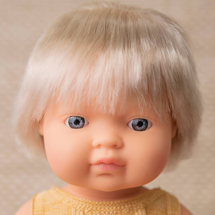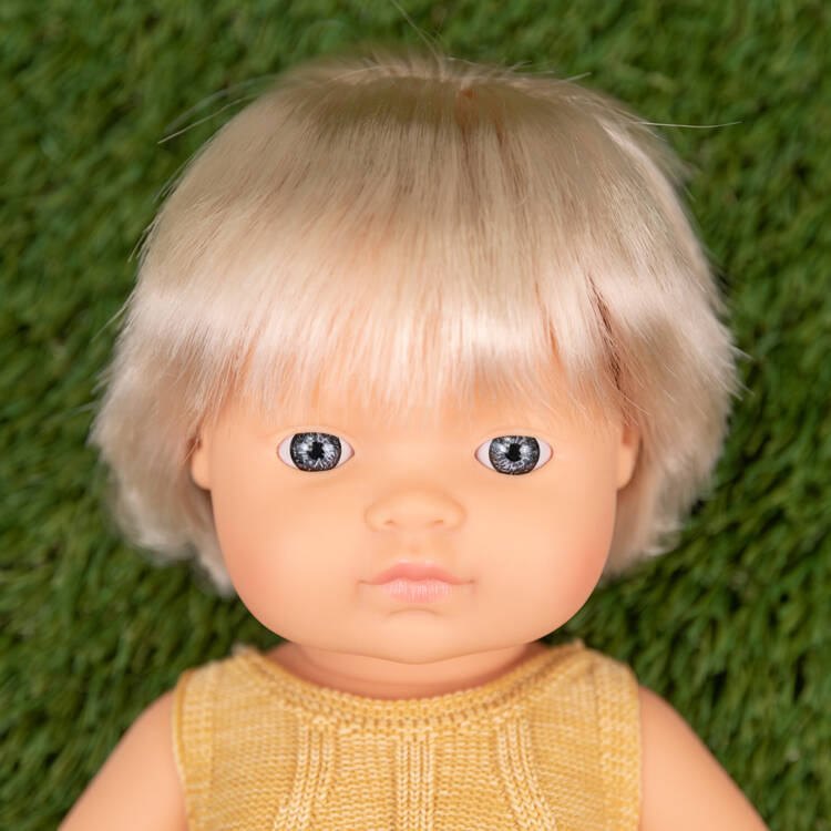 Laleczka dziewczynka Europejka z implantem ślimakowym przymocowanym na stałe przy uchu z kolekcji Colourful Edition w całości wykonana jest z przyjemnego w dotyku winylu. Ma zaznaczoną płeć. Na główce ma jasnoblond włosy z grzywką. Ma ruchome rączki, nóżki i głowę. Siedzi samodzielnie.