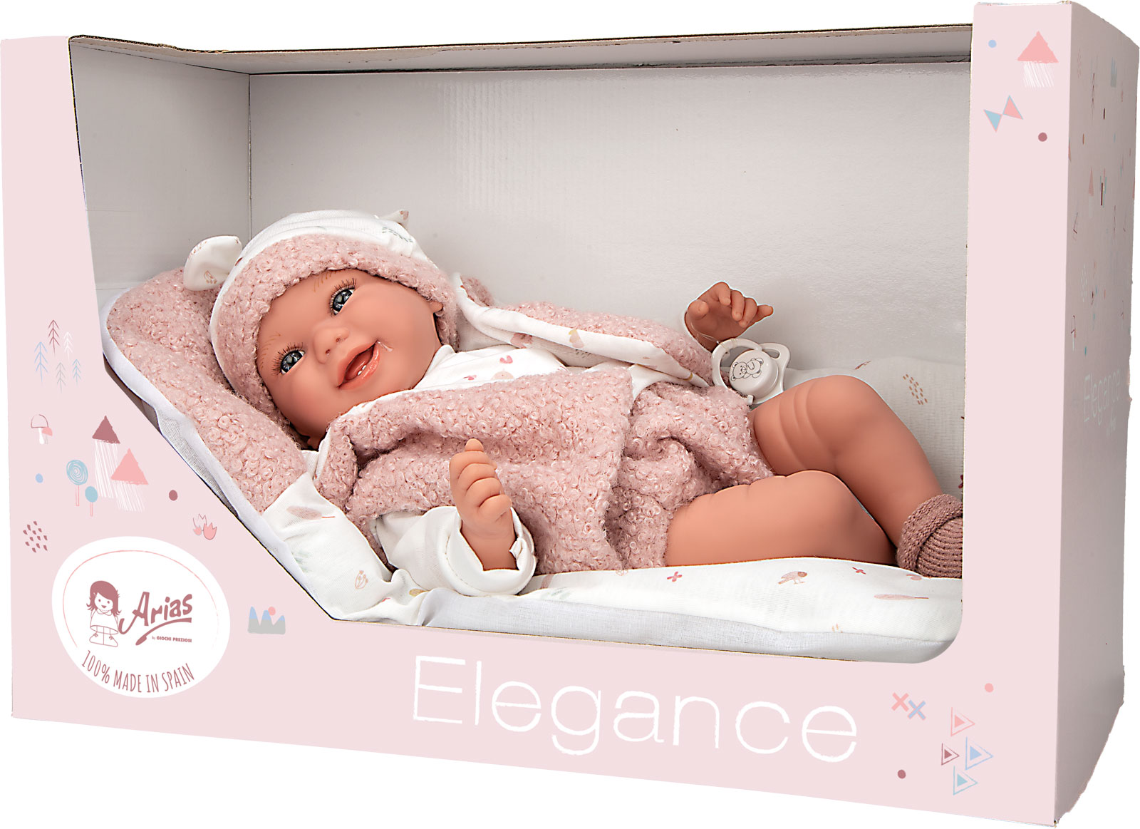Urocza, uśmiechnięta, duża laleczka w ubranku w eleganckim pudełku to idealny prezent dla małej dziewczynki. Rzeźbienia na główce imitujące krótkie włoski noworodka, zaznaczone fałdki na skórze i linie papilarne, piękne rzęsy, widoczne dwa ząbki, namalowana ślinka w kąciku ust oraz katarek w nosku sprawiają, że laleczka wygląda jak prawdziwe niemowlę. Głowa, rączki i nóżki wykonane są z gładkiego i przyjemnego w dotyku winylu. Brzuszek uszyty jest z materiału i wypełniony miękką wyściółką. W zależności od ubranka może odgrywać rolę dziewczynki lub chłopca.
