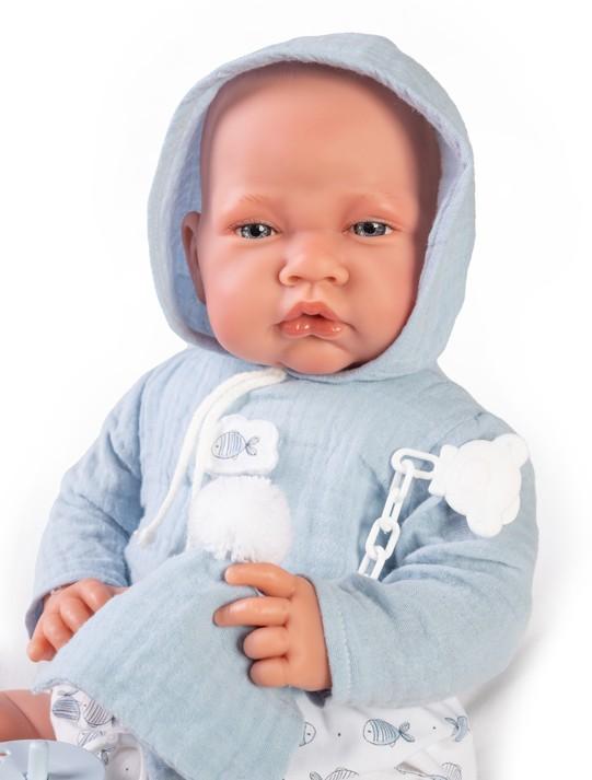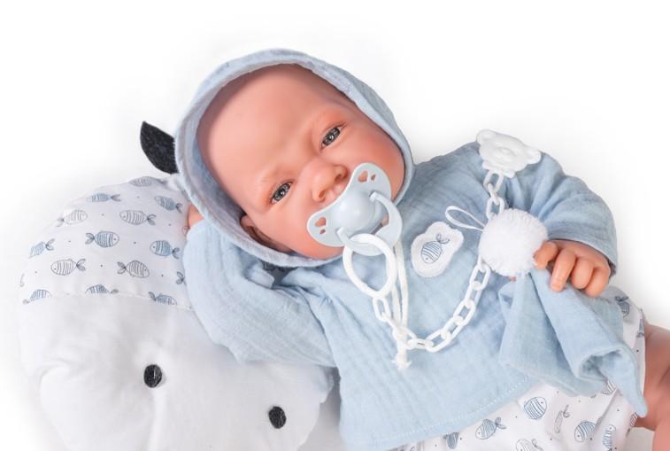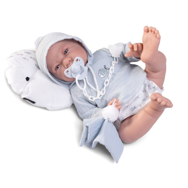 MATEO - lalka z tej serii to niezwykle uroczy bobas. Głowa, rączki i nóżki wykonane są z przyjemnego w dotyku winylu. Ruchome w stawach, dzięki temu lalka może przybierać różne pozycje. Brzuszek uszyty jest z materiału i wypełniony miękką wyściółką. Na główce ma rzeźbienia imitujące krótkie włoski noworodka. W zależności od ubranka lalka może odgrywać rolę dziewczynki lub chłopca.