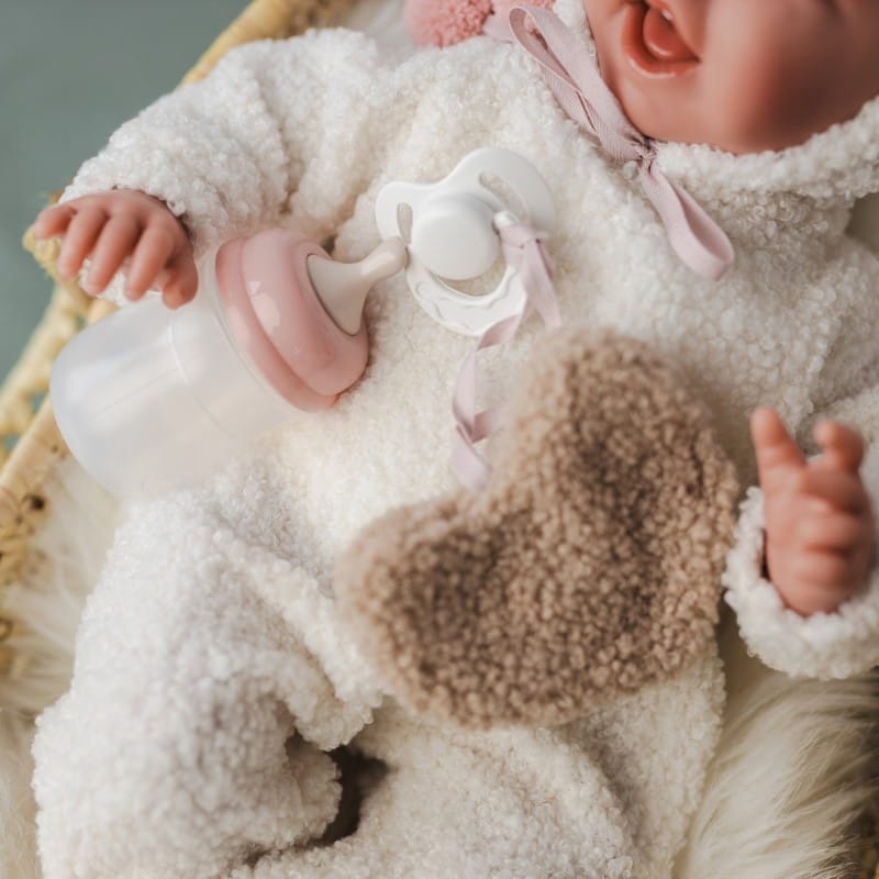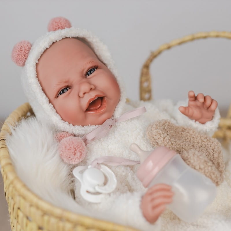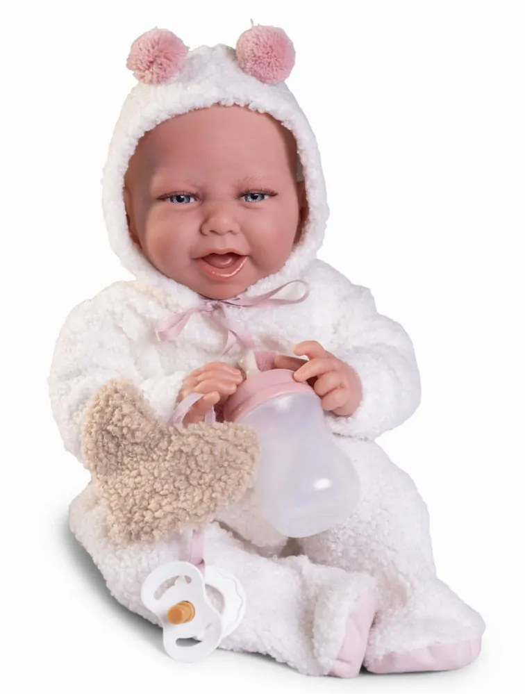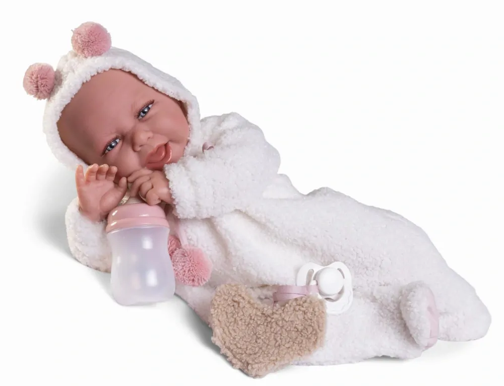 CARLA - laleczka ta jest specjalnym modelem lalki cięższej o ok. 500g od innego tego typu lalek. Waży ok. 1960g. Waga i wzrot zbliżony jest do wagi noworodka. Jest niezwykle uroczym bobaskiem. W otwartej buzi widoczny jest języczek i ząbki. Głowa, rączki i nóżki wykonane są z gładkiego i przyjemnego w dotyku winylu. Ruchome w stawach, dzięki temu lalka może przybierać różne pozycje i samodzielnie siedzieć. Brzuszek uszyty jest z materiału i wypełniony miękką wyściółką. Na główce ma rzeźbienia imitujące krótkie włoski noworodka. W zależności od ubranka może odgrywać rolę dziewczynki lub chłopca.