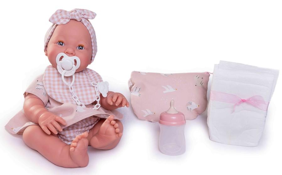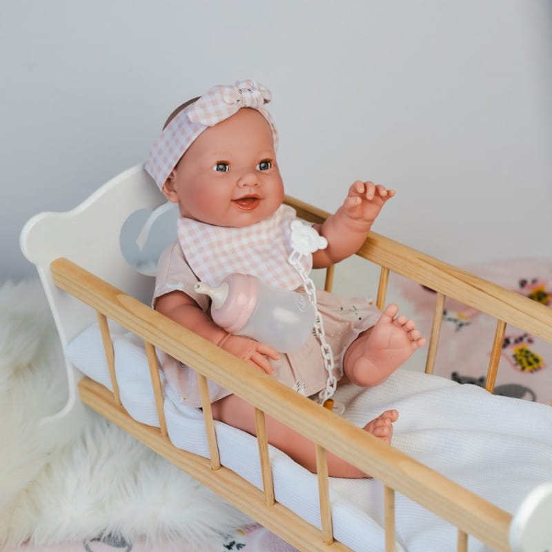 MIA SIKAJĄCA - lalka z tej serii to słodki, uśmiechnięty bobas wyglądający jak prawdziwe dziecko. Ma zaznaczoną płeć - dziewczynka, lekko wystający pępuszek, paznokcie, fałdki na ciele, na dłoniach i stopach widoczne linie papilarne. Laleczka zamyka oczy, pije z buteleczki i robi siku. W całości wykonana jest z przyjemnego w dotyku winylu. Na główce ma rzeźbienia imitujące krótkie włoski noworodka. Ma ruchome rączki, nóżki i głowę, dzięki temu może przybierać różne pozycje. Siedzi samodzielnie.