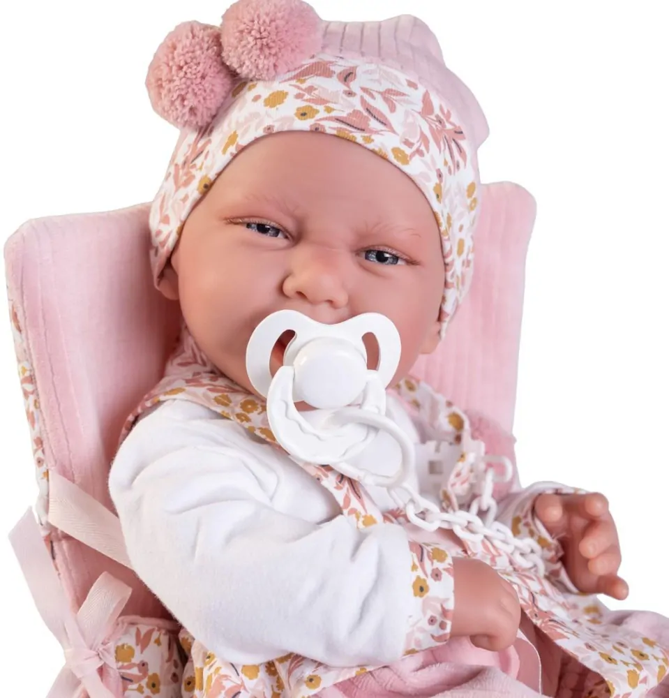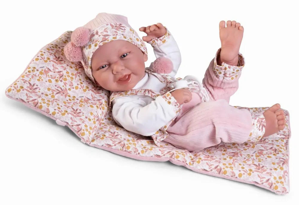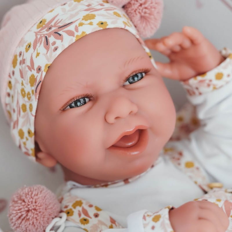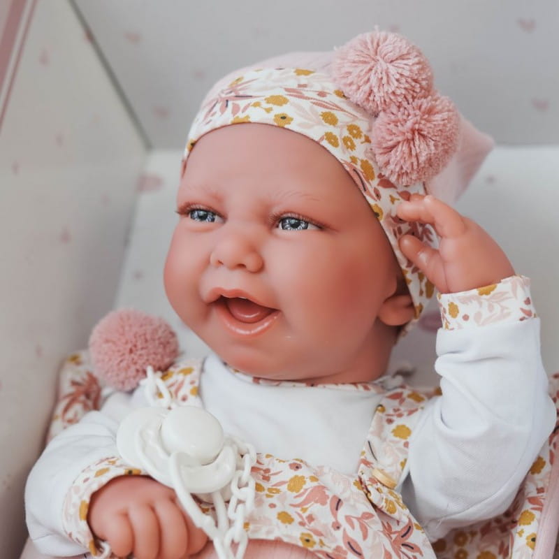 CARLA - lalka z tej serii to radosny, uśmiechnięty bobas wyglądający jak prawdziwe dziecko. Ma zaznaczoną płeć - dziewczynka i lekko wystający pępuszek. Zachwyca dopracowanymi detalami takimi jak: długie rzęsy, wyraźne zaznaczone paznokcie, fałdki na ciele, na dłoniach i stopach widoczne linie papilarne. Na główce ma rzeźbienia imitujące krótkie włoski noworodka. W otwartej buzi widoczny jest języczek i ząbki. Lalka w całości wykonana jest z przyjemnego w dotyku winylu. Ma ruchome rączki, nóżki i głowę. Dzięki temu może przybierać różne pozycje. Siedzi samodzielnie.