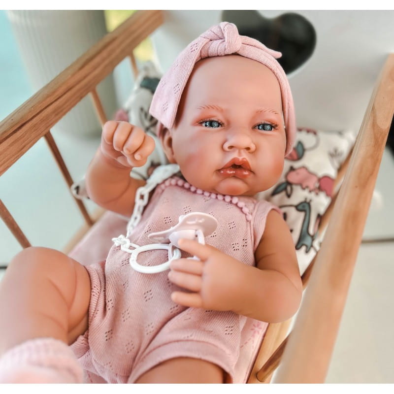 GABRIELA - lalka z tej serii to niesamowicie uroczy bobas wyglądający jak prawdziwe dziecko. Ma zaznaczoną płeć - dziewczynka, lekko wystający pępuszek, fałdki na ciele, na stopach i dłoniach widoczne linie papilarne. W całości wykonana jest z przyjemnego w dotyku winylu. Na główce ma rzeźbienia imitujące krótkie włoski noworodka. Ma ruchome rączki, nóżki i głowę. Siedzi samodzielnie.