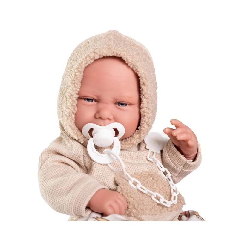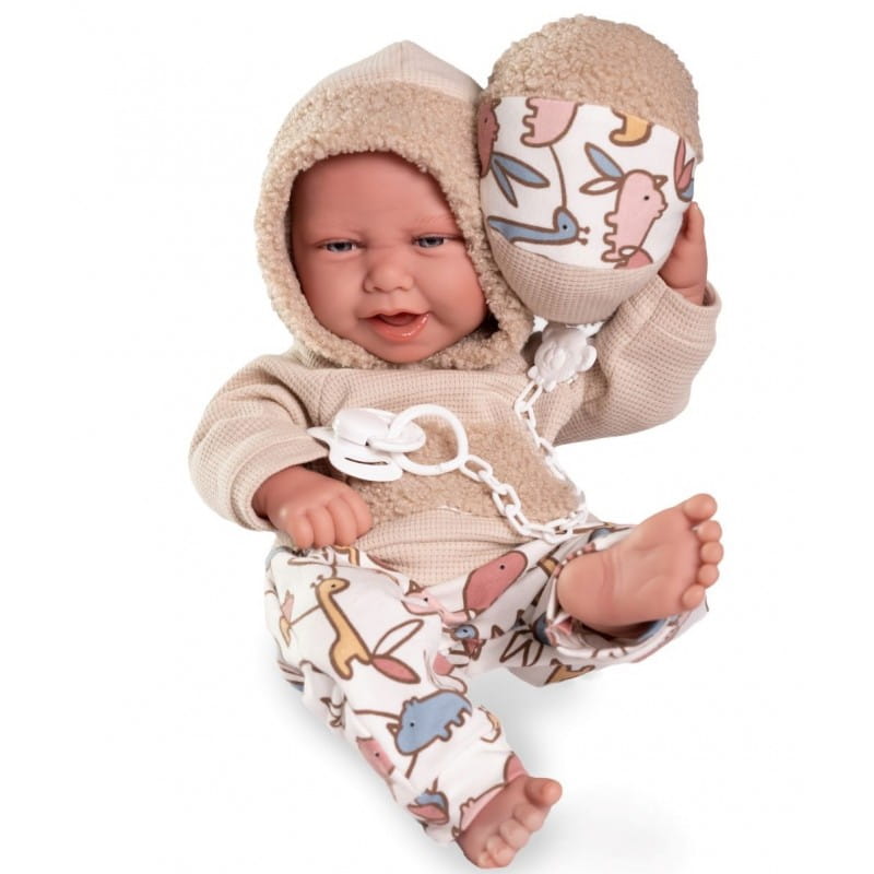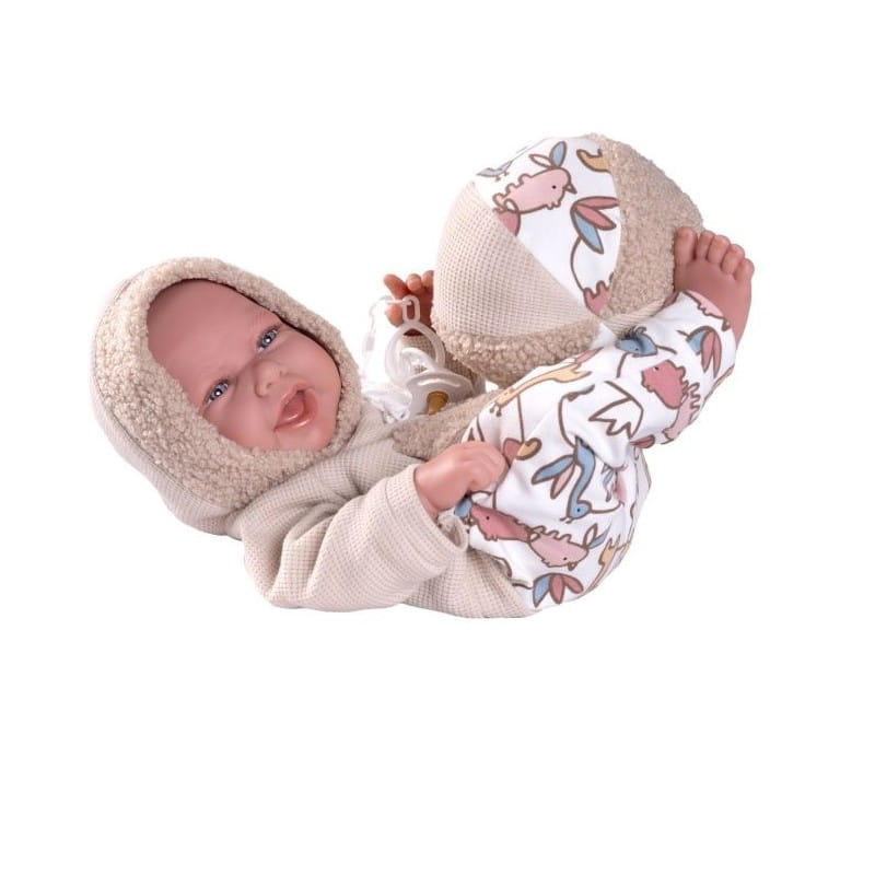CARLO - lalka z tej serii to radosny, uśmiechnięty bobas wyglądający jak prawdziwe dziecko. Ma zaznaczoną płeć - chłopiec i lekko wystający pępuszek. Zachwyca dopracowanymi detalami takimi jak: długie rzęsy, wyraźne zaznaczone paznokcie, fałdki na ciele, na dłoniach i stopach widoczne linie papilarne. Na główce ma rzeźbienia imitujące krótkie włoski noworodka. W otwartej buzi widoczny jest języczek i ząbki. Lalka w całości wykonana jest z przyjemnego w dotyku winylu. Ma ruchome rączki, nóżki i głowę. Dzięki temu może przybierać różne pozycje. Siedzi samodzielnie.