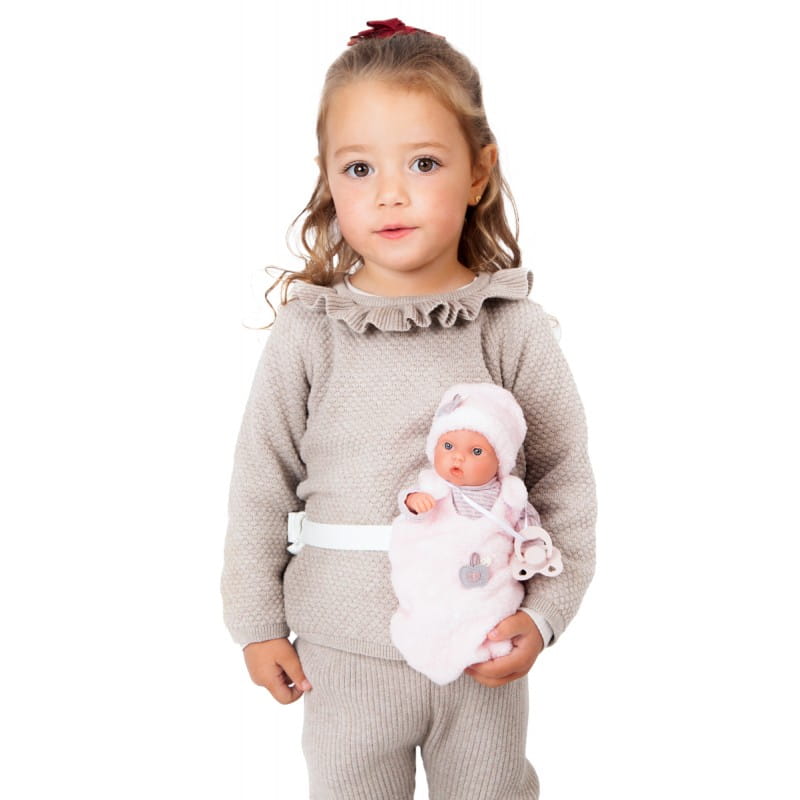 Słodkie maleństwo Picolin od firmy Antonio Juan to niewielka laleczka o wysokości 21 cm. Laleczka ma zaznaczoną płeć - jest dziewczynką. Na główce ma rzeźbienia, które przypominają krótkie włoski noworodka. Uroku dodają jej duże, niebieskie oczka, malutki nosek, błyszczące usta, zaznaczone fałdki i linie papilarne. Zabawka ze względów bezpieczeństwa przeznaczona jest do zabawy dla dzieci od 2 roku życia.