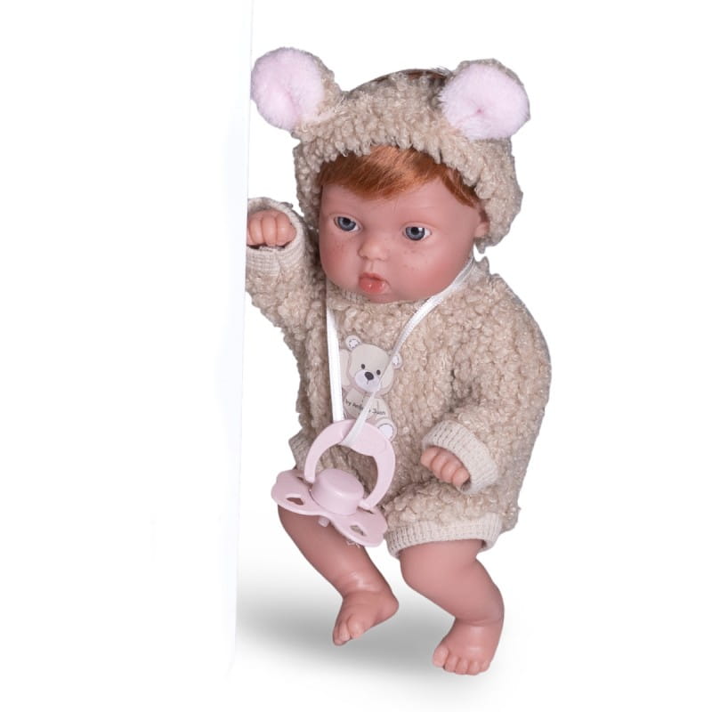 Słodkie maleństwo Picolin od firmy Antonio Juan to niewielka laleczka o wysokości 21 cm. Laleczka ma zaznaczoną płeć - jest dziewczynką. Na główce ma krótkie rude włoski. Uroku dodają jej duże, niebieskie oczka, malutki nosek, delikatne piegi na buzi, błyszczące usta, zaznaczone fałdki i linie papilarne. Zabawka ze względów bezpieczeństwa przeznaczona jest do zabawy dla dzieci od 2 roku życia.