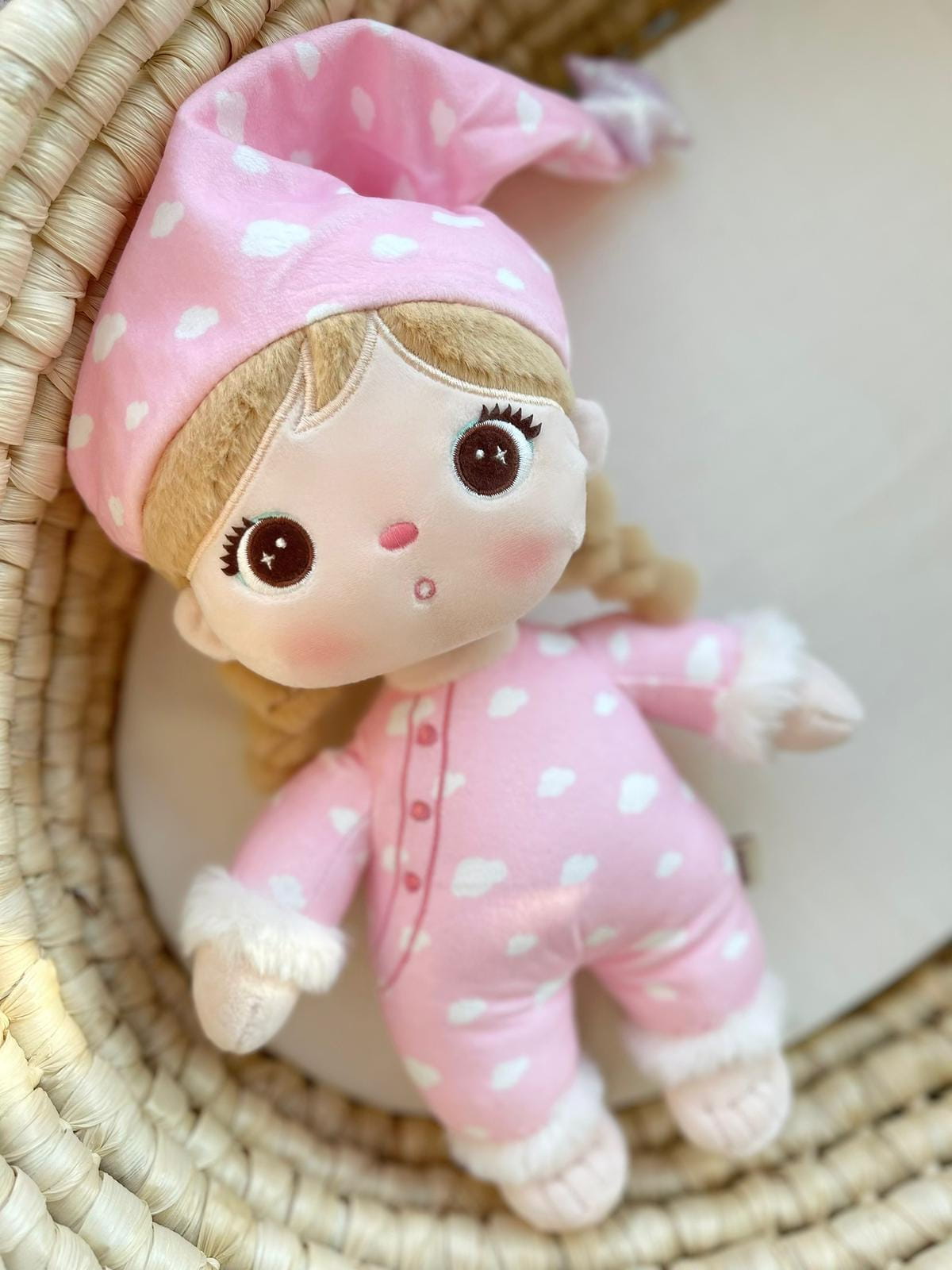 Dziewczynka w piżamce 30 cm to niezwykle słodka lalka Metoo, która swoim pastelowym urokiem wprowadza odrobinę magii do dziecięcego świata. Ubrana w różową piżamkę w białe chmurki, idealnie oddaje klimat beztroskich, spokojnych snów. Na głowie ma dopasowaną czapeczkę z tym samym wzorem, a dodatkowa gwiazdka na czapce nadaje jej wyjątkowego charakteru. Warkoczyki wykonane z miękkiego materiału dodają jej dziewczęcego uroku, a jej wyraz twarzy – z dużymi oczami i zaróżowionymi policzkami – zachęca do zabawy i przytulania.