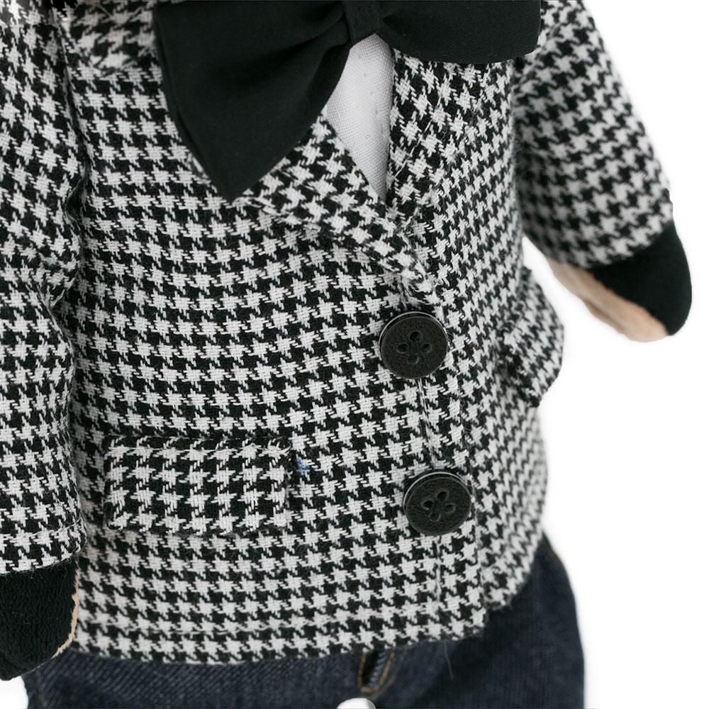 Piesek Buzz to uroczy czarny chihuahua. Na końcach górnych łap ma magnesy, które pozwalają na trzymanie łapek razem. Ubrany jest w marynarkę w biało-czarną pepitkę, koszulę z muszką i spodnie jeansy. Ubranka zapinane na rzep. Piesek zapakowany jest w pudełko prezentowe. Na spodzie pudełka znajdują się tekturowe elementy do zmontowania wieszaka na ubrania.