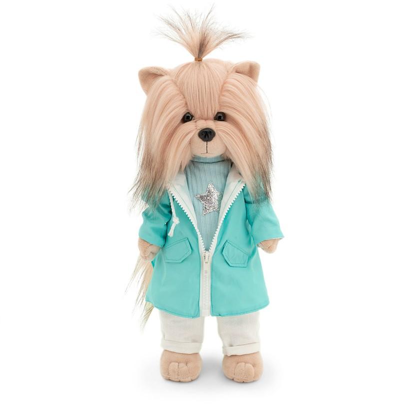 Piesek Yoyo to uroczy jasnobeżowy yorkshire terrier. Zgina łapki (rączki i nóżki). Yoyo ma na sobie seledynowy płaszczyk, niebieska bluzka, białe spodnie. Piesek zapakowany jest w pudełko prezentowe. Na spodzie pudełka znajdują się tekturowe elementy do zmontowania wieszaka na ubrania.