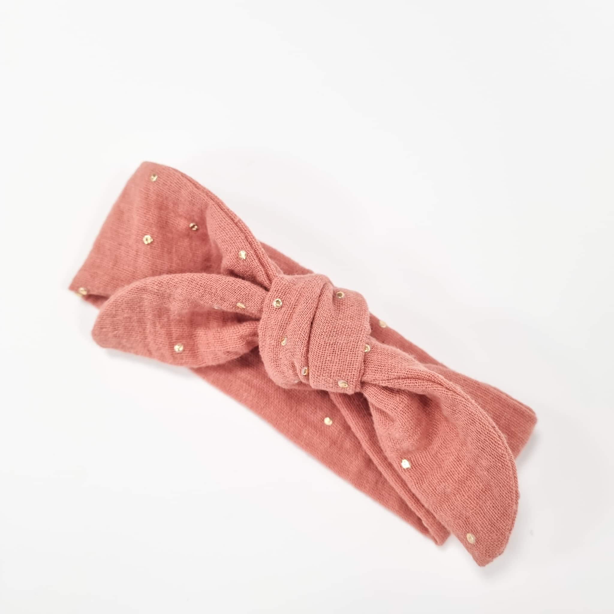 Zawiązywana opaska w kolorze morelowym ozdobiona złotymi kropeczkami.