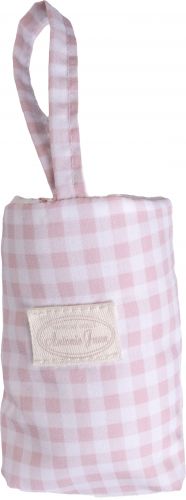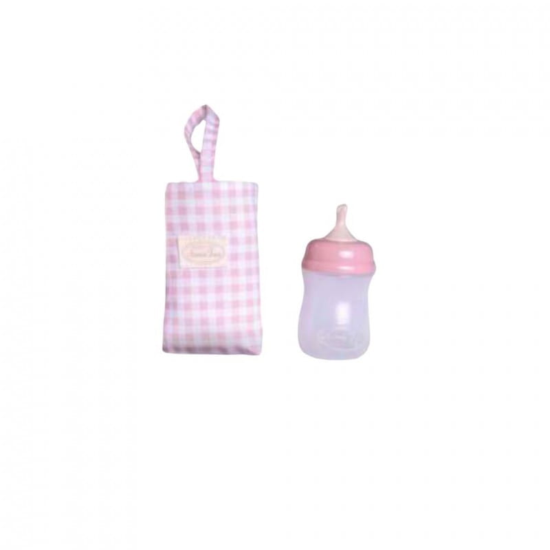 Plastikowa butelka na wodę dla lalki w komplecie z miękką torebką w stylową biało-różową kratkę.