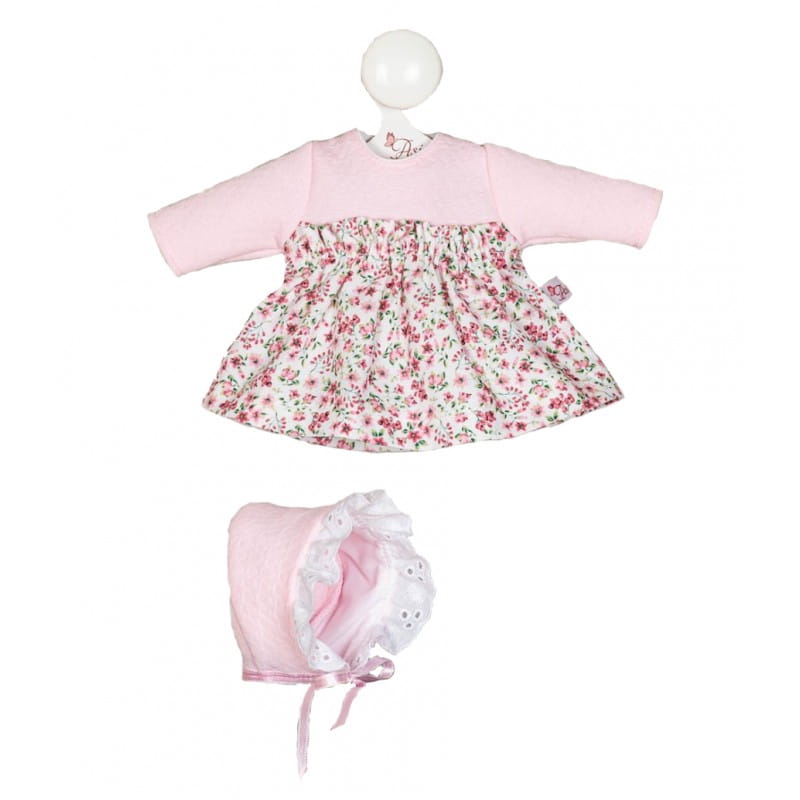 - sukienka długi rękaw, zapinana na rzep, góra różowa, dół w kwiatuszki