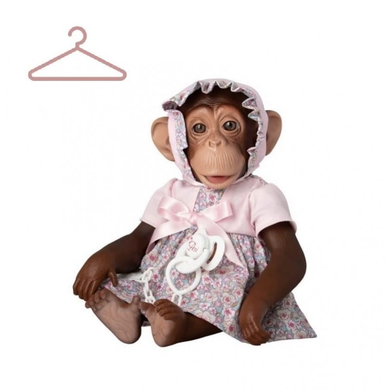 Niebiesko-różowa bawełniana sukienka w uroczy kwiatuszkowy wzór została ozdobiona satynową, lśniącą kokardką. Całość uzupełnia wiązana różowa czapeczka wykończona kolorową falbanką. Ręcznie szyty strój został zaprojektowany specjalnie dla małpki hiszpańskiej o imieniu Lola z unikalnej kolekcji ASI Animal Reborn.