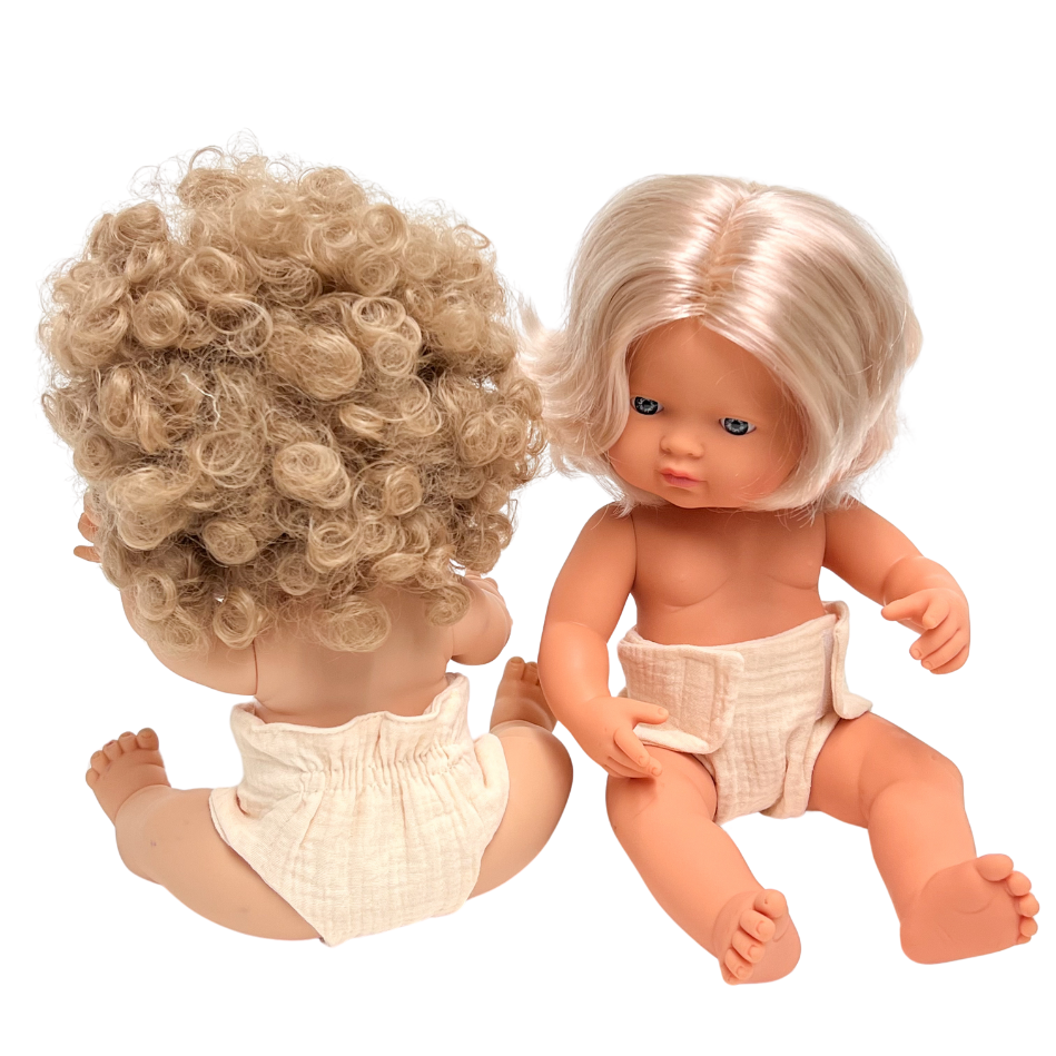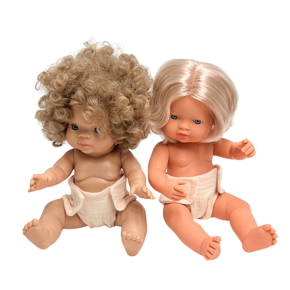 Dwie eko pieluszki uszyte specjalnie dla hiszpańskich lalek Miniland 38 cm. Pasują również na lalki Minikane 34 cm i lalki Paola Reina 34 cm.