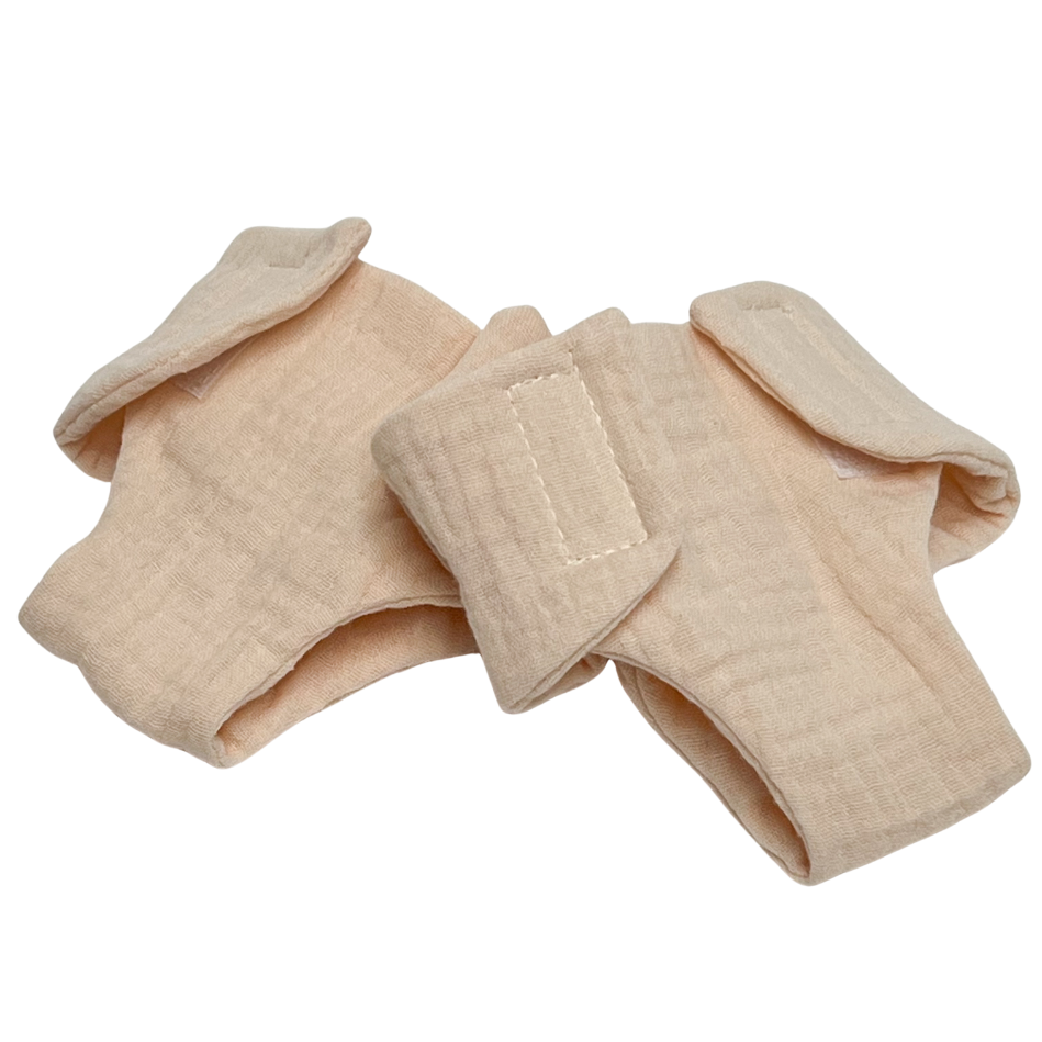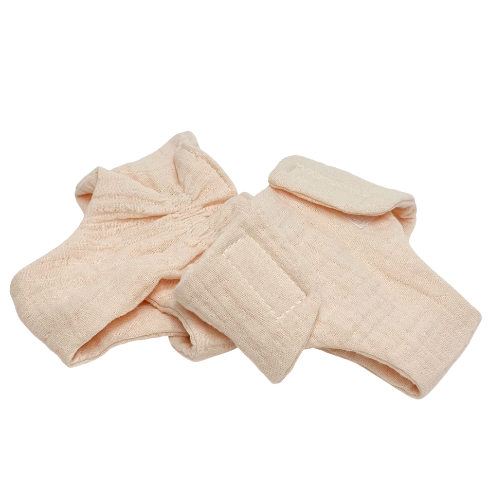 Pieluszki uszyte z bawełnianego muślinu w kolorze kremowym. Pieluszki zapinane na rzep, z tyłu wszyta gumka.