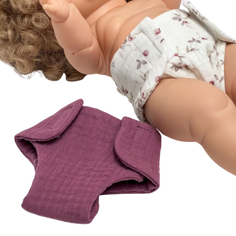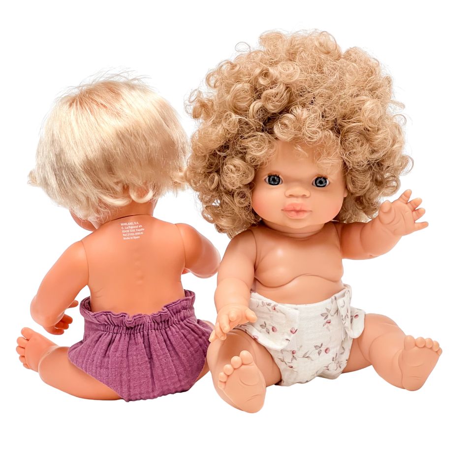 Dwie eko pieluszki uszyte specjalnie dla hiszpańskich lalek Miniland 38 cm. Pasują również na lalki Minikane 34 cm i lalki Paola Reina 34 cm.