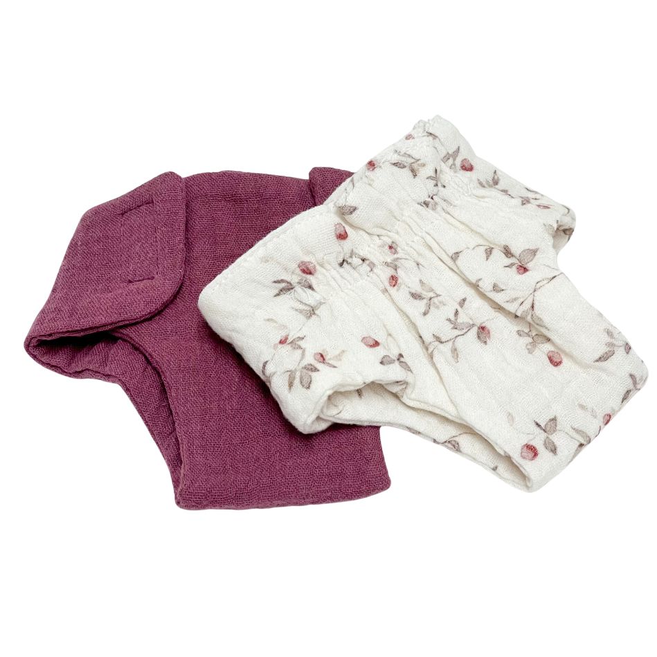 Pieluszki uszyte z bawełnianego muślinu. Jedna w kolorze kremowym z nadrukiem delikatnych gałązek i drobniutkich jabłuszek, druga w kolorze jagodowym. Pieluszki zapinane na rzep, z tyłu wszyta gumka.