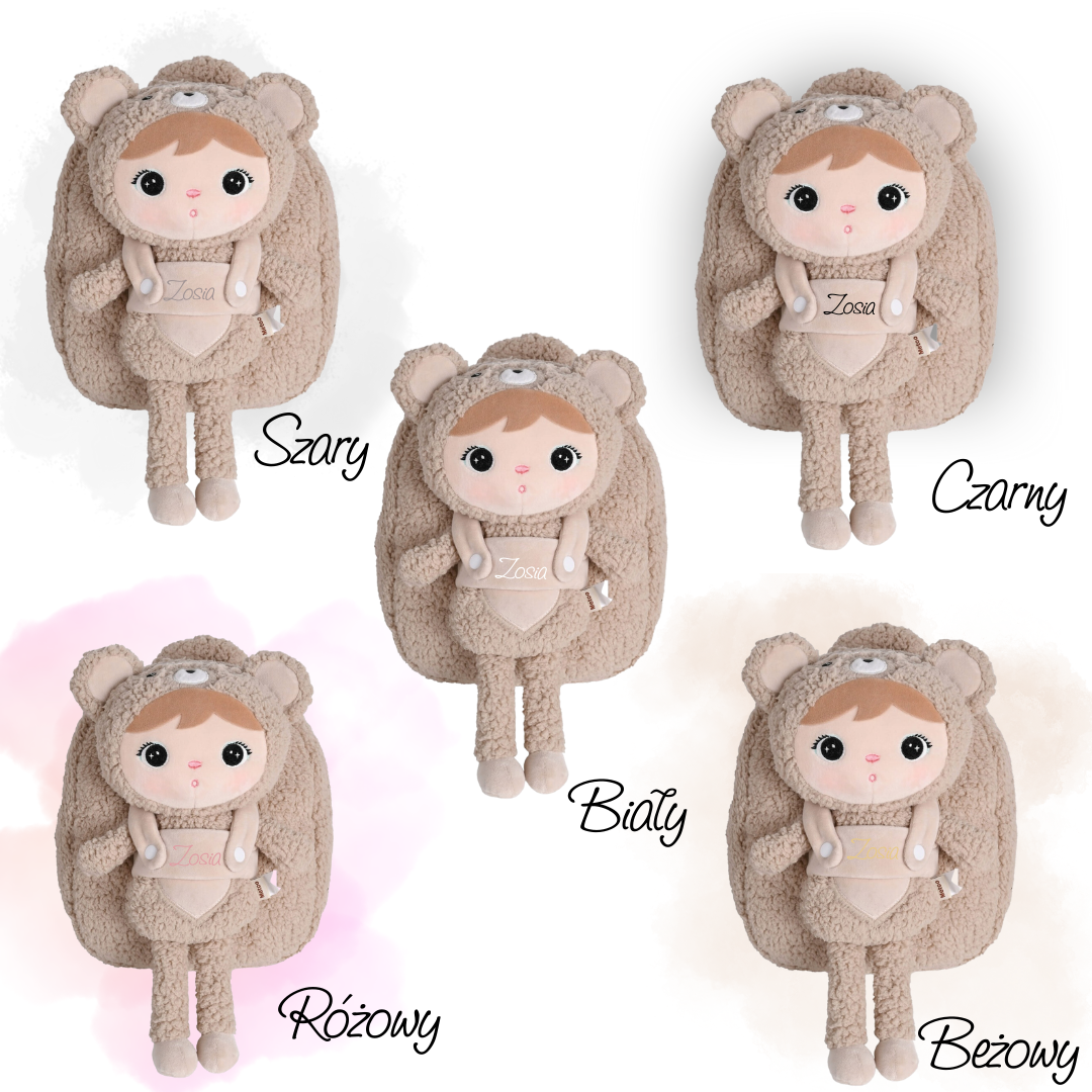 Plecak może zostać na życzenie spersonalizowany. Imię umieszczane jest na pasku trzymającym lalkę lub na serduszku lalki. Jest Też możliwość aby umieścić imiona na obu elementach.