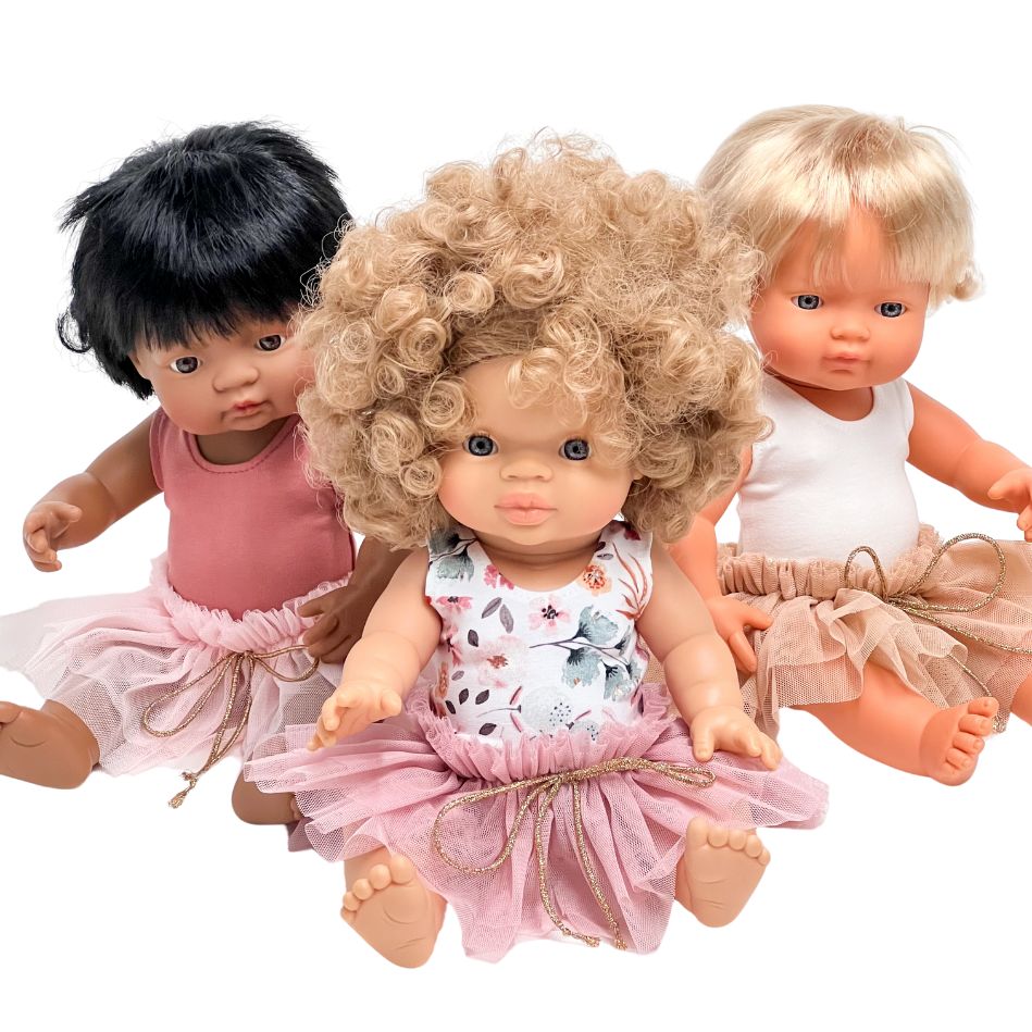 Tiulowa spódniczka tutu w kolorze ciemnego różu uszyta specjalnie dla hiszpańskich lalek Miniland 38 cm. Pasuje również na lalki Minikane 34 cm i lalki Paola Reina 34 cm.