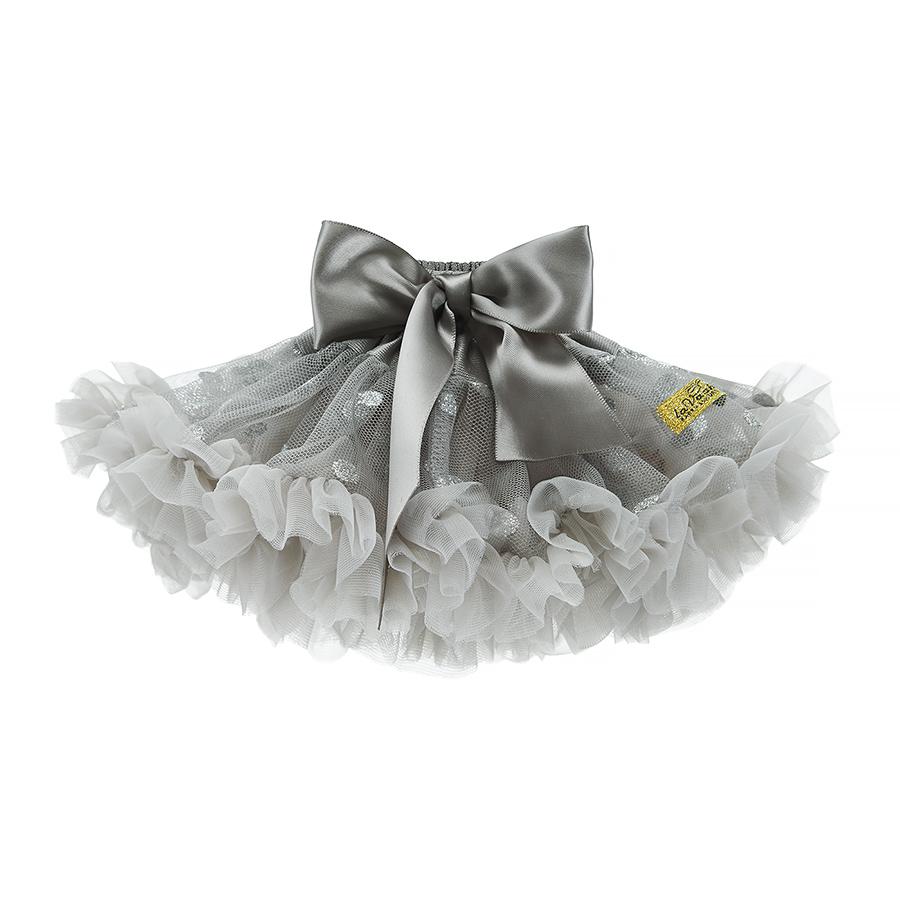Piękna spódniczka tutu w kolorze szarym ze srebrnymi grochami uszyta z dwóch warstw tiulu, dół dodatkowo obszyty falbankami. Jest niesamowicie "puszysta".