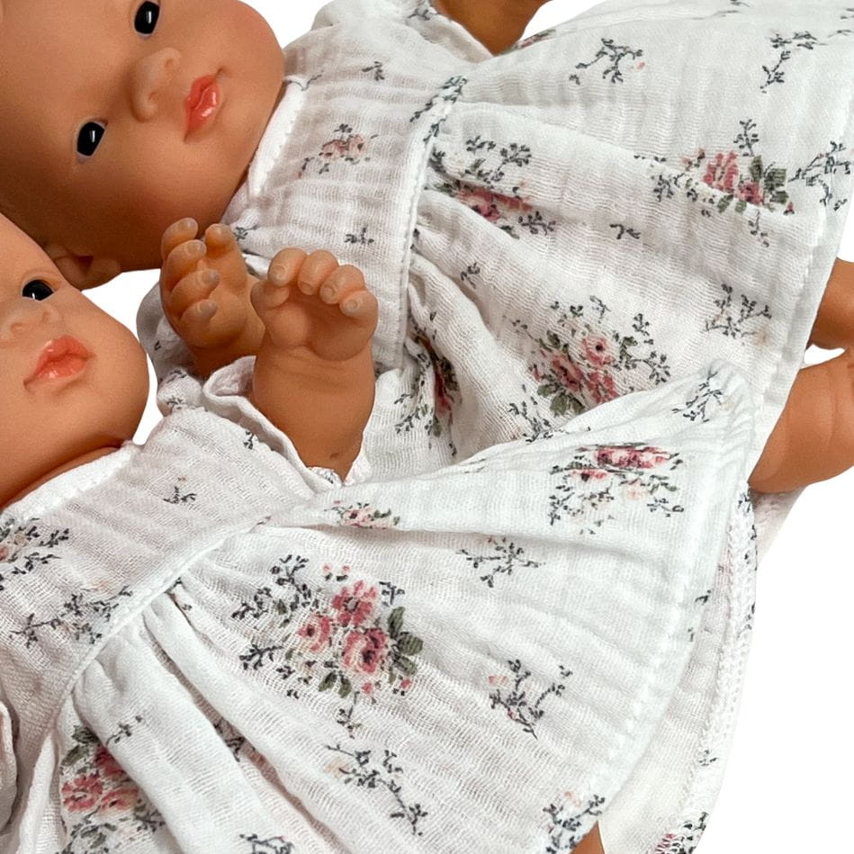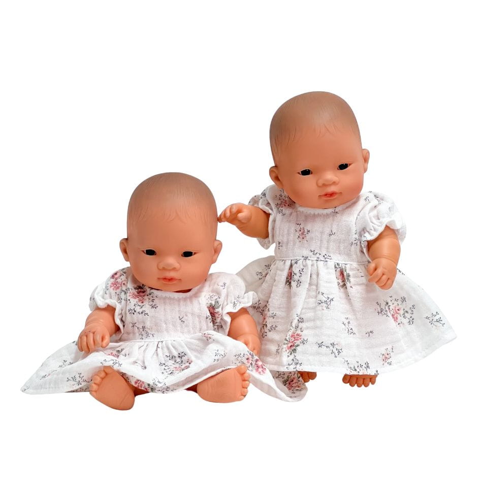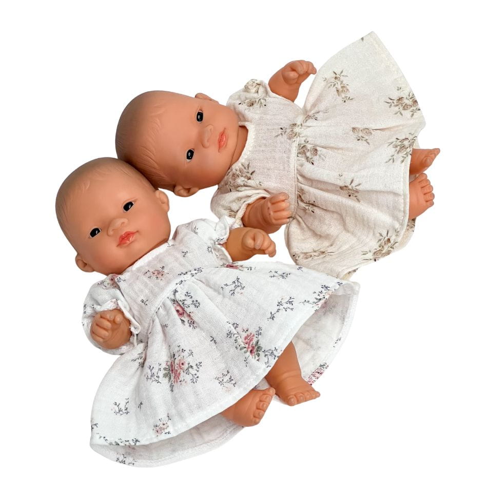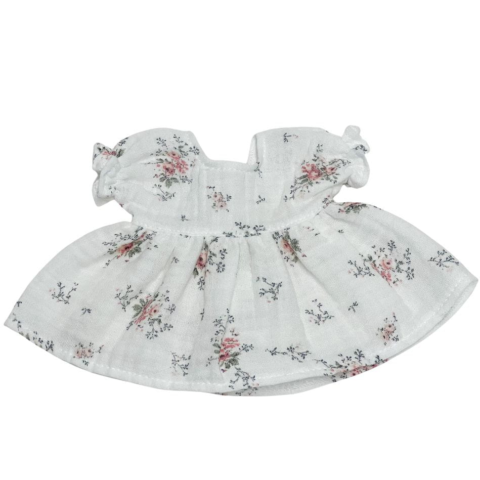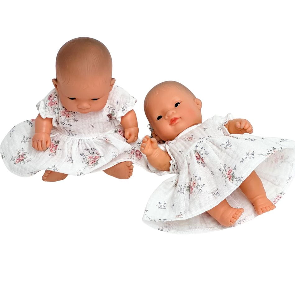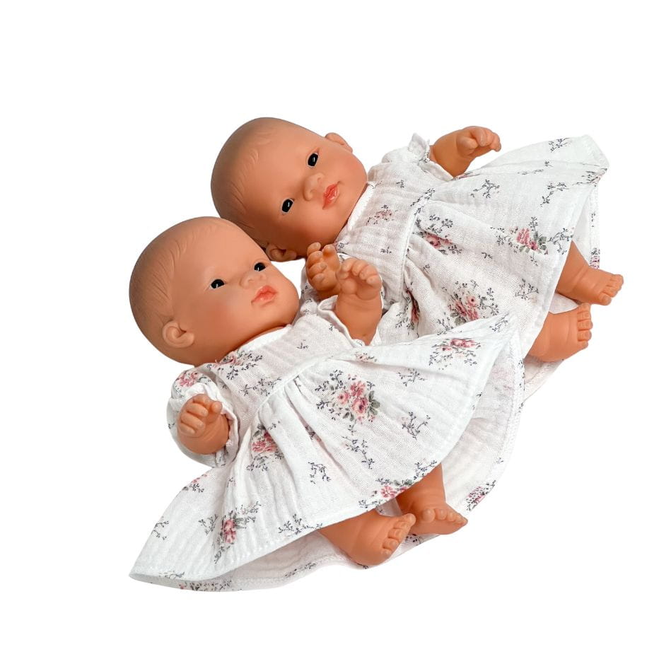 Sukienka muślinowa dla lalki Miniland 21 cm i Paola Reina Peques 21 cm - biała w różowe kwiaty